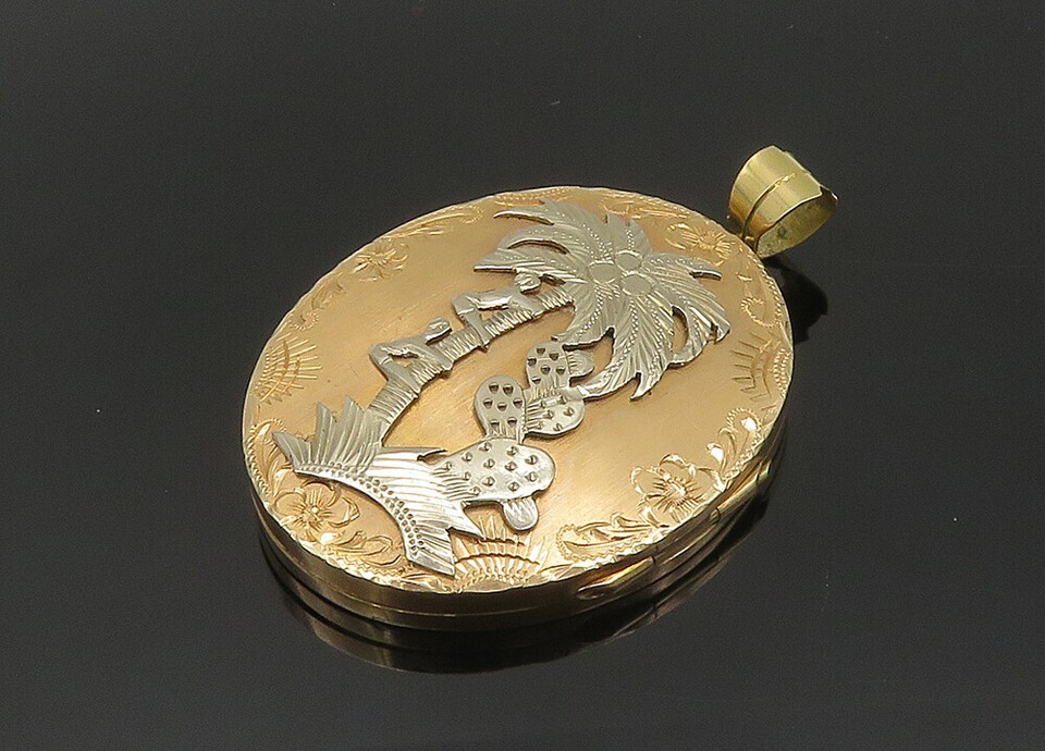 Authenticity Guarantee 14K GOLD Vintage Two Tone Palm Tree Island Scene Loc...