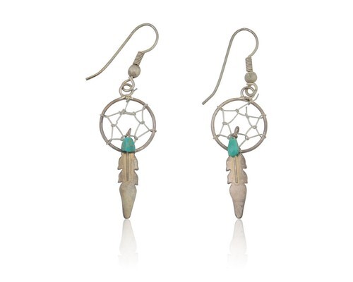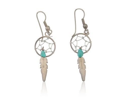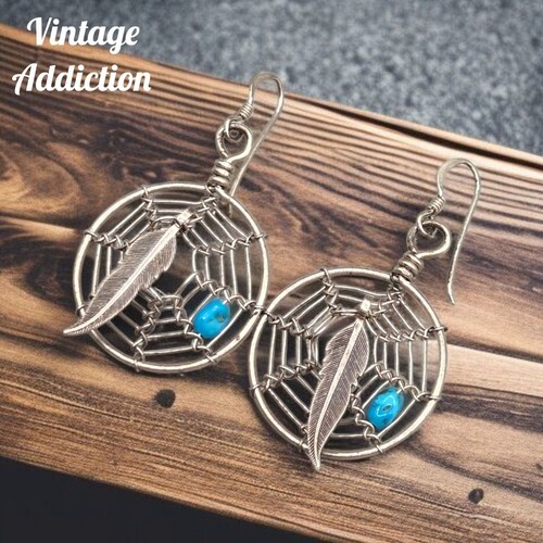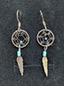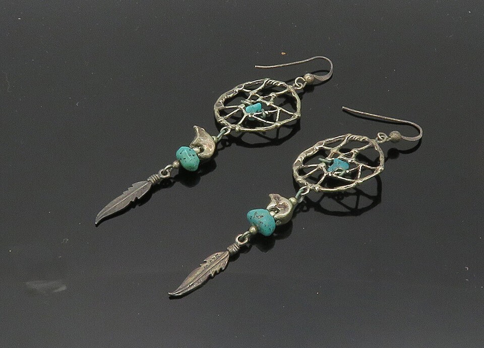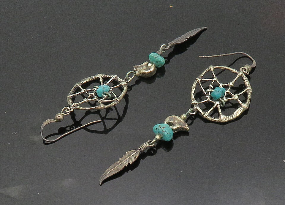 NAVAJO 925 Silver Vintage Turquoise Dream Catcher Dangle Earrings EG10366