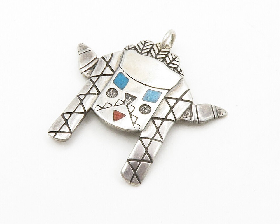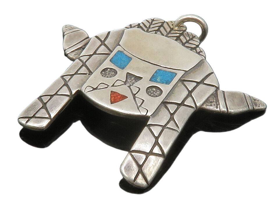 KONIN KACHINA ZUNI 925 Silver Vintage Turquoise & Coral Pendant PT10902