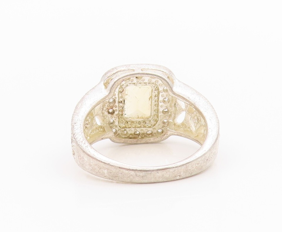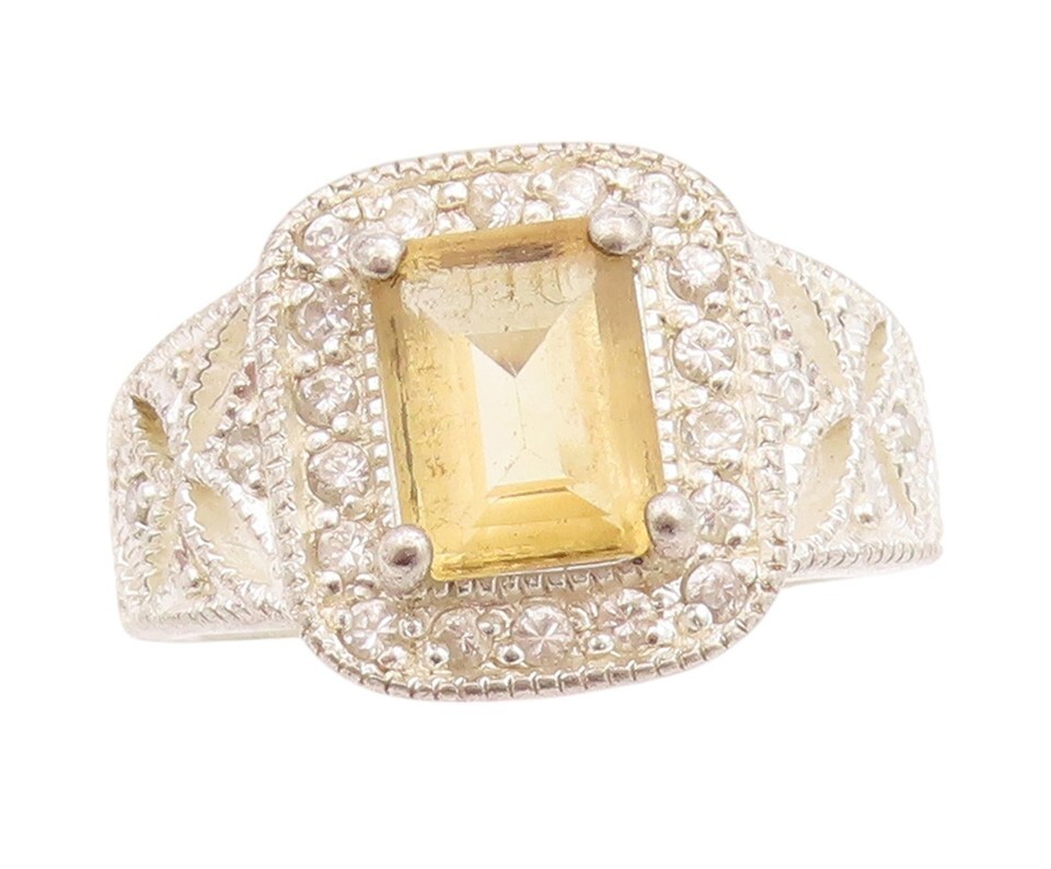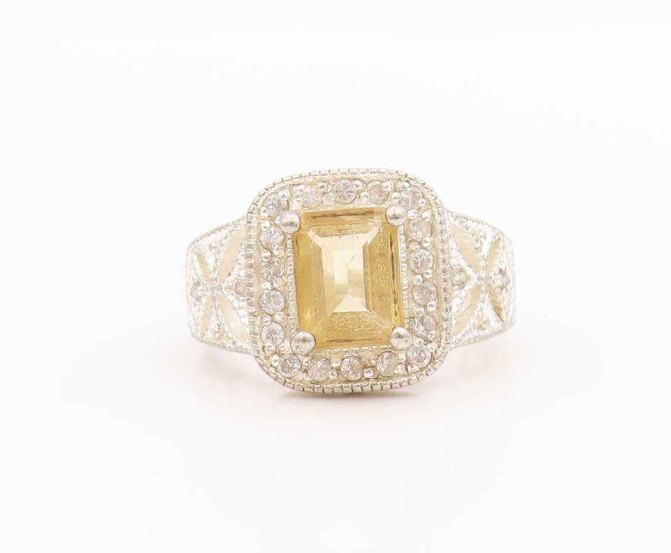 925 Sterling Silver Vintage Ring Rectangle Cut Citrine Halo CZ Sz 7 RG33226