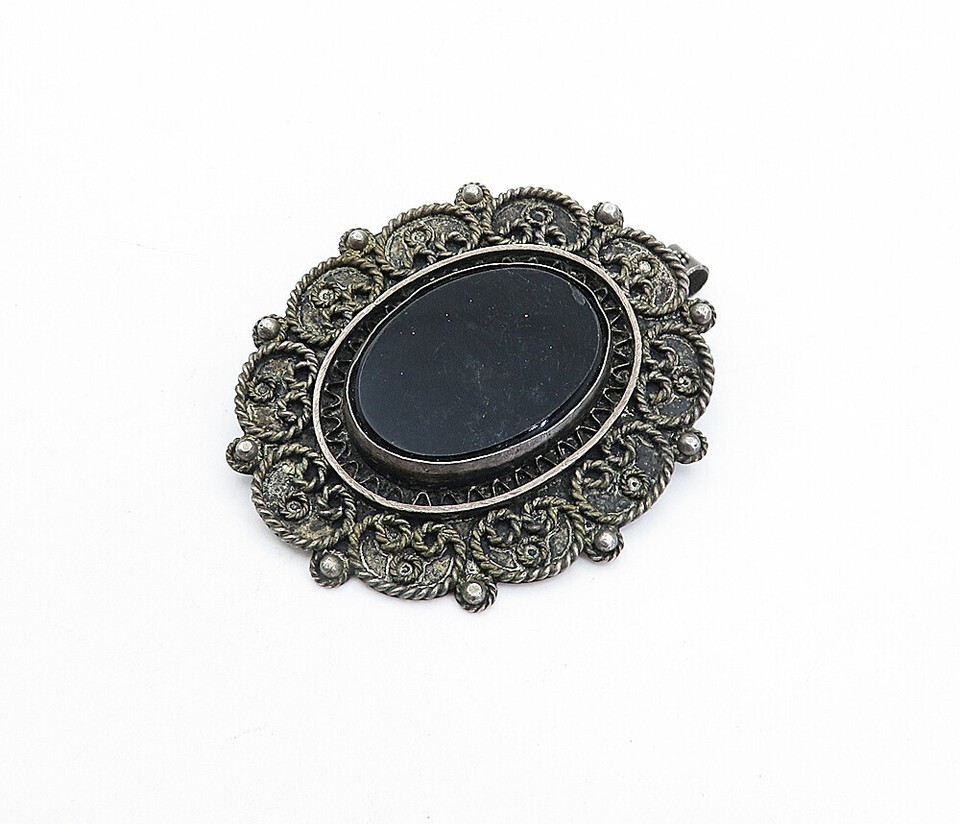 ISRAEL 925 Sterling Silver Vintage Black Onyx Swirl Twist Brooch Pin BP1413