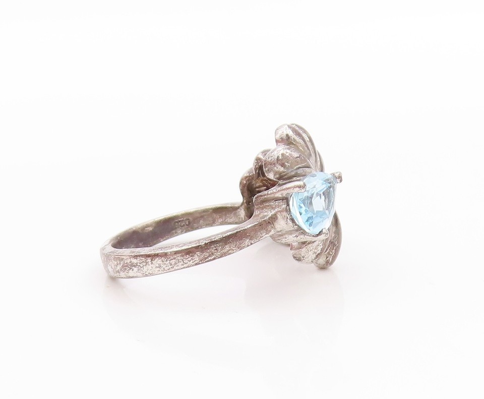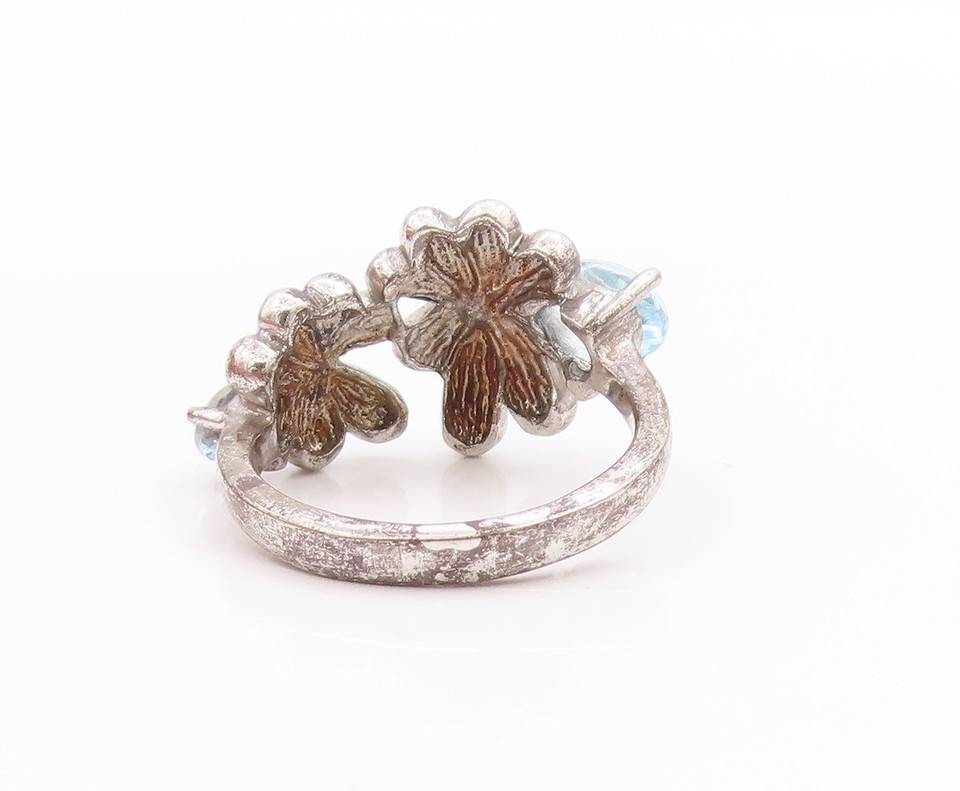 925 Sterling Silver Vintage Ring Blue Topaz Floral Cut Out Band Sz 7.5 RG33491
