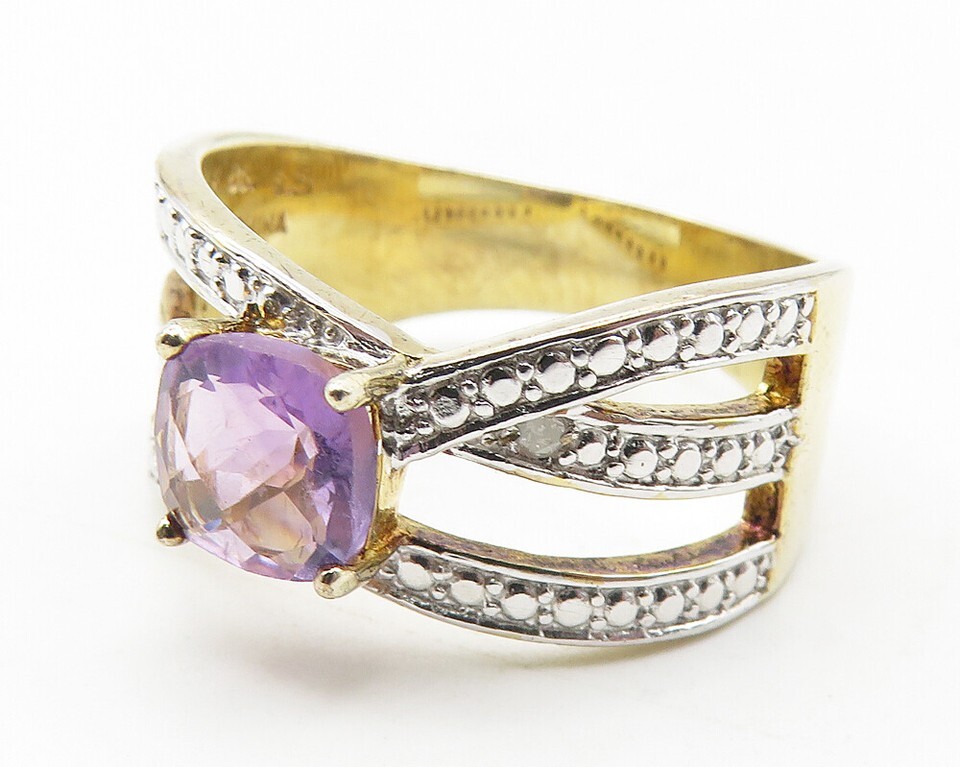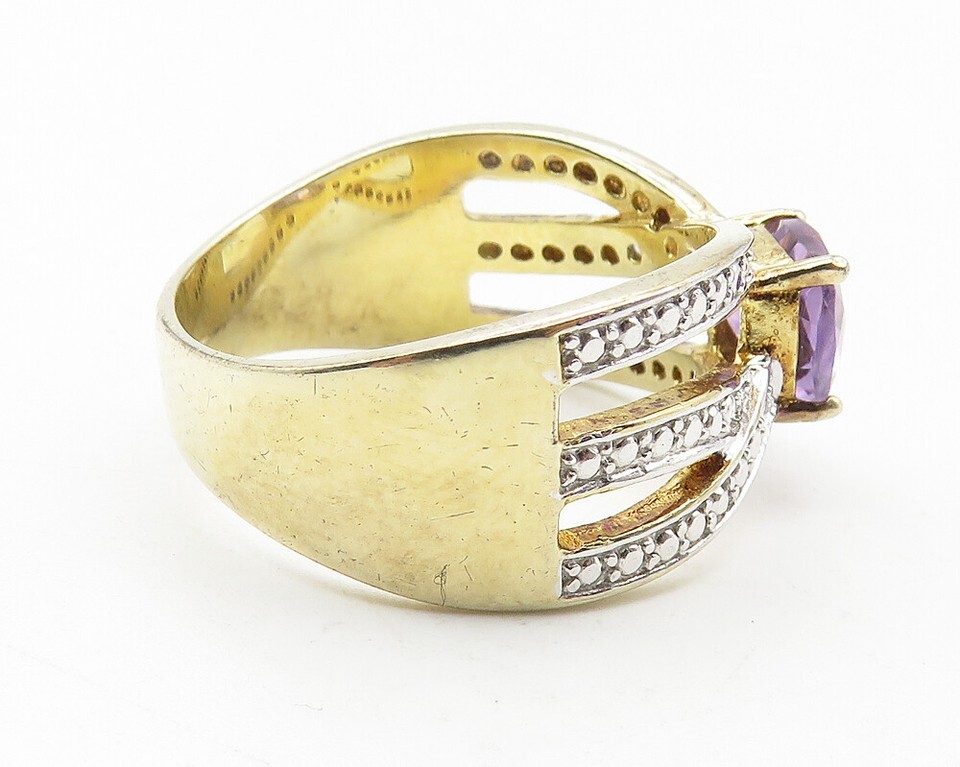 925 Sterling Silver Amethyst & Genuine Diamond 2 Tone Band Ring Sz 8 RG11562