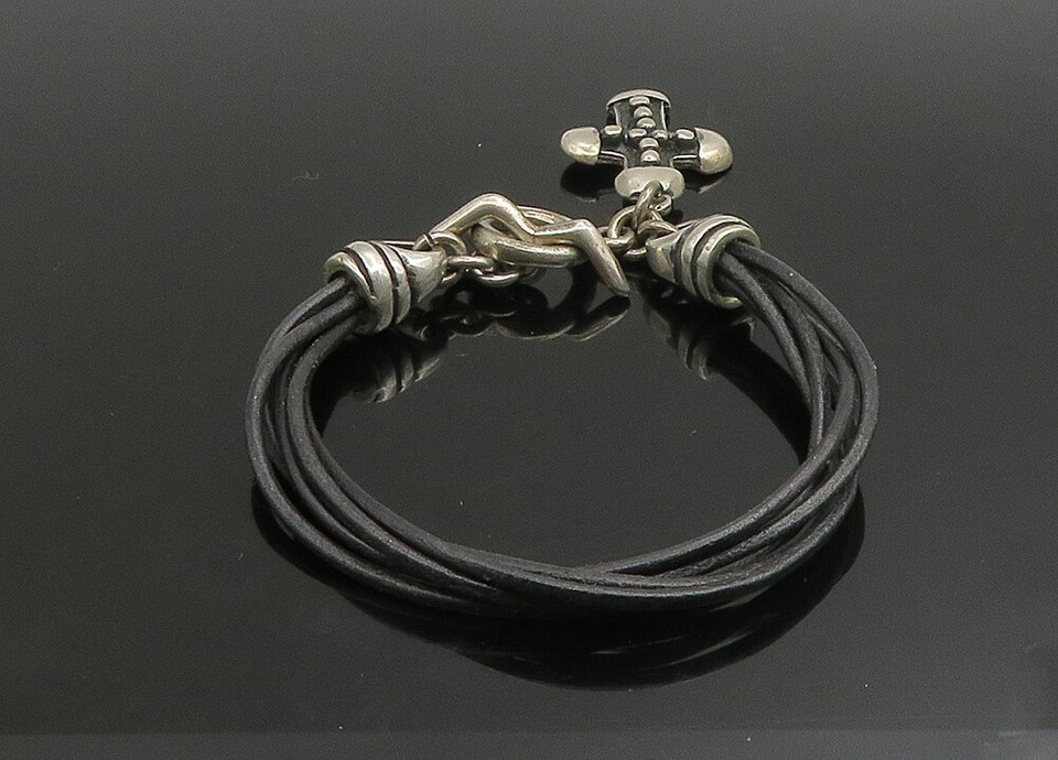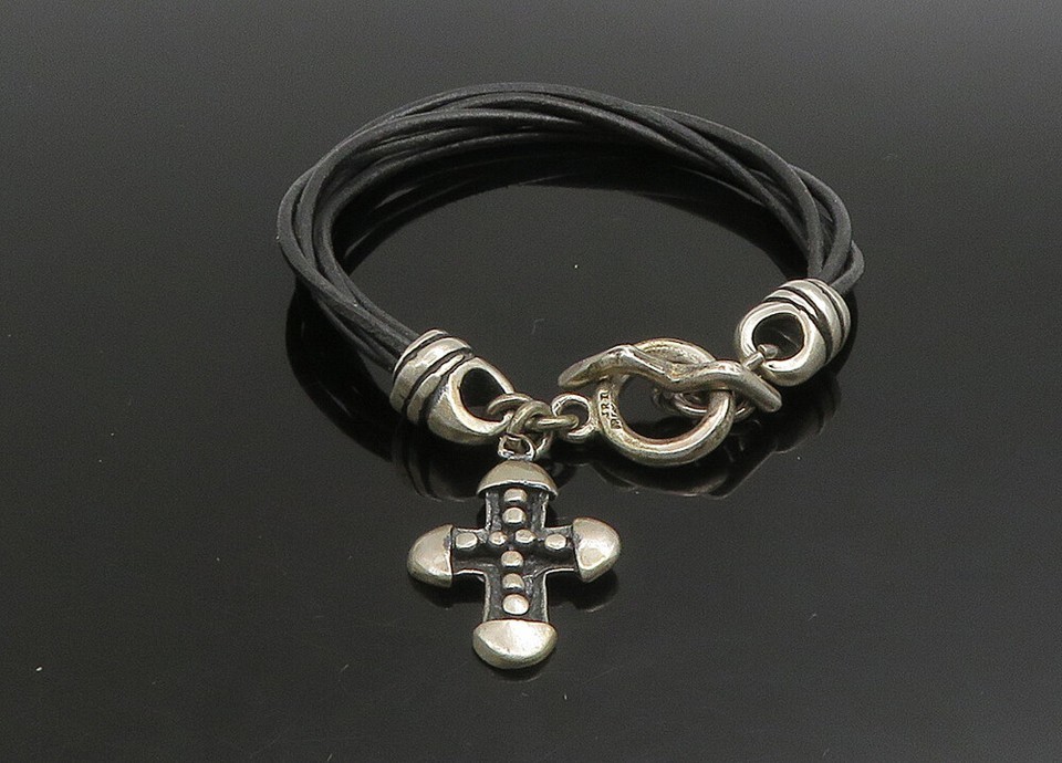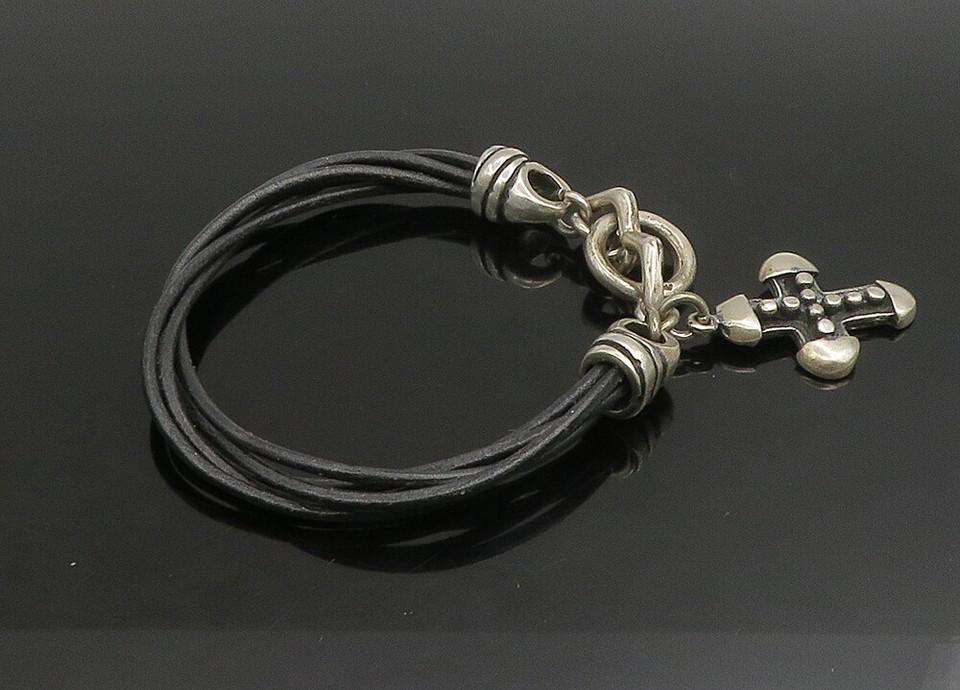 JRI MEXICO 925 Silver Vintage Religious Cross Leather Rope Bracelet BT9099