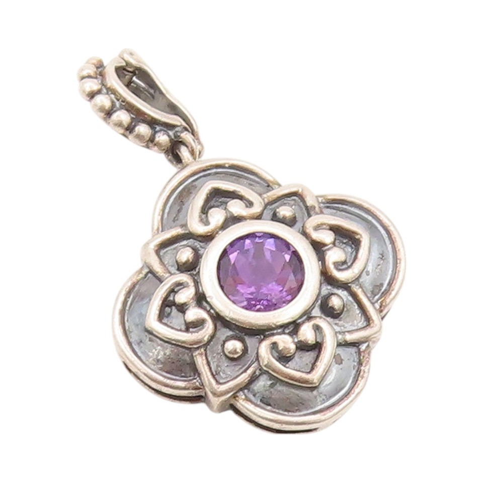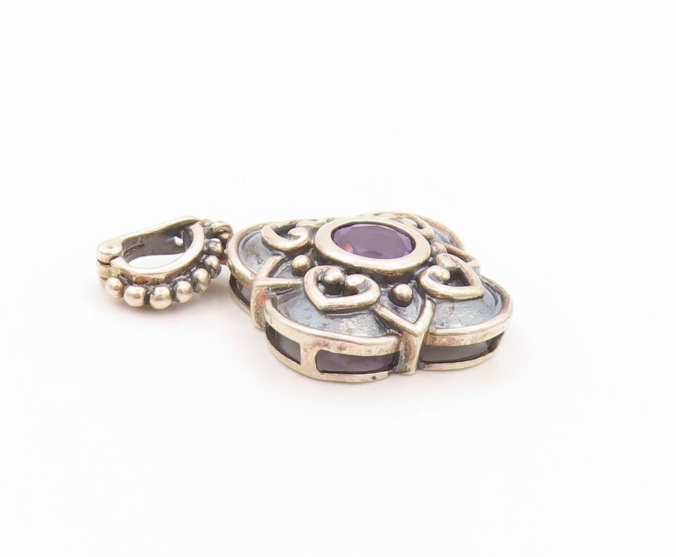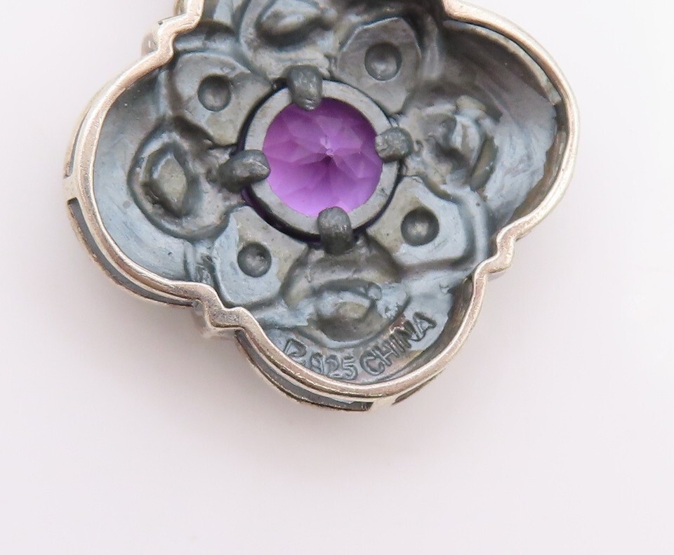 925 Sterling Silver Vintage Pendant Dark Tone Amethyst Floral Carved PT24099