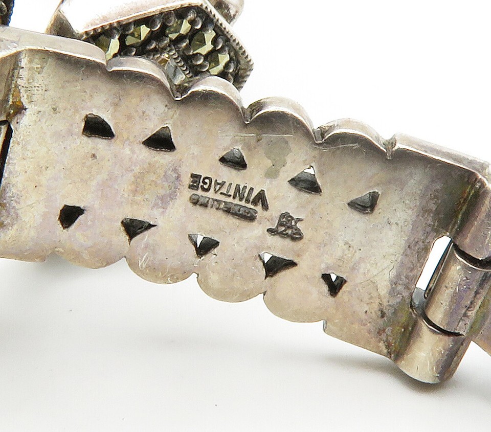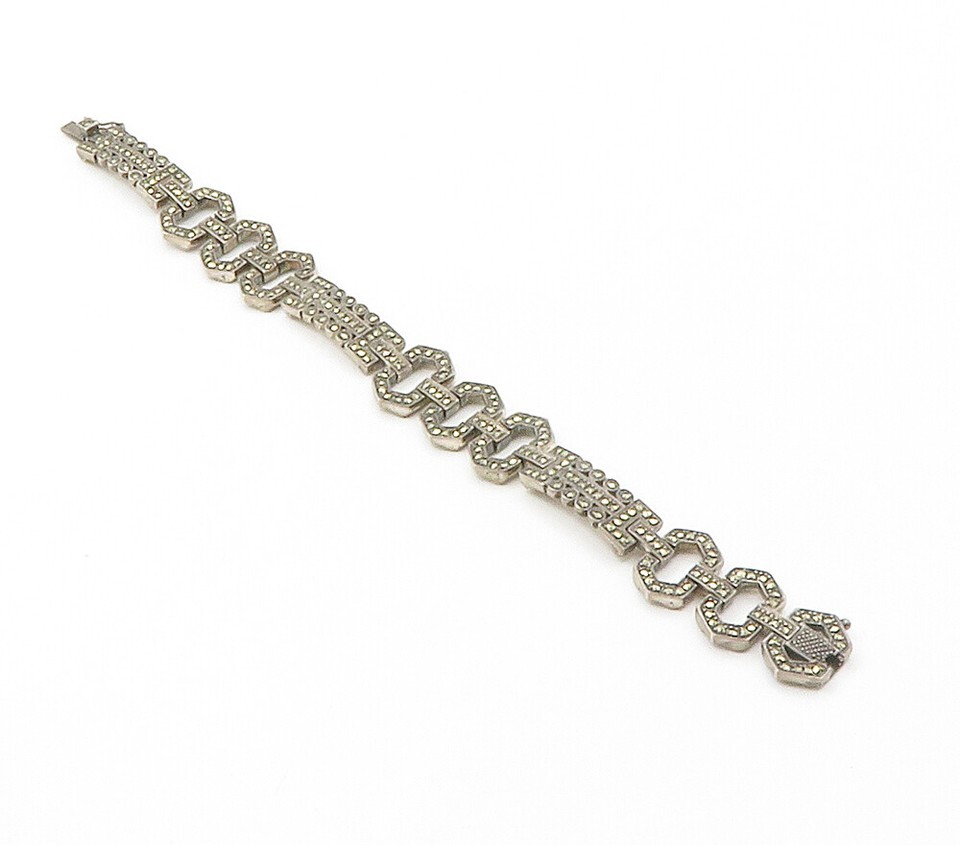 925 Sterling Silver Vintage Sparkling Marcasite Hinge Chain Bracelet BT5915