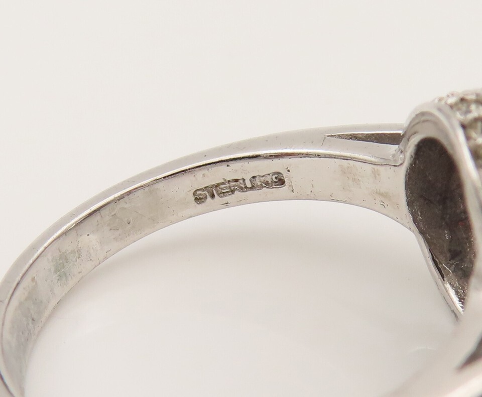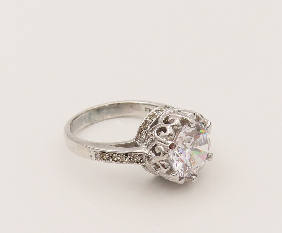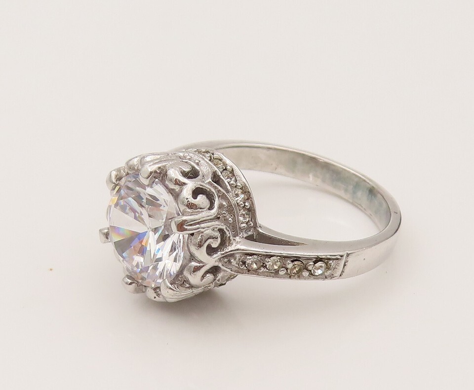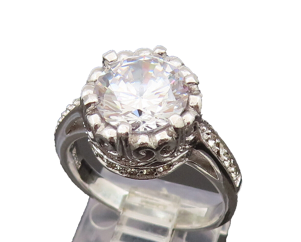 925 Silver Vintage Dancing Cubic Zirconia Scrollwork Halo Ring Sz 7.5 RG26492