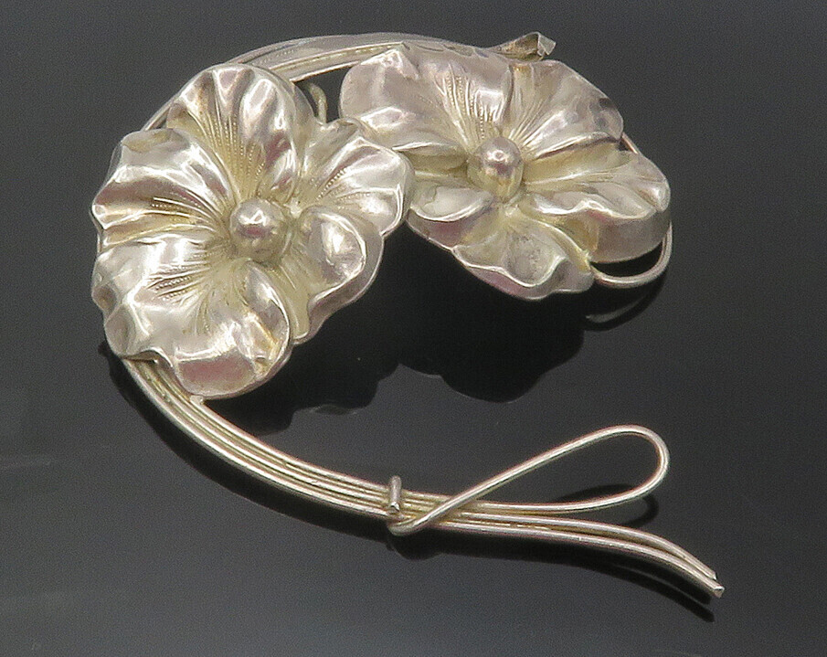 925 Sterling Silver Vintage Shiny Flowers & Leaf Motif Brooch Pin BP4369