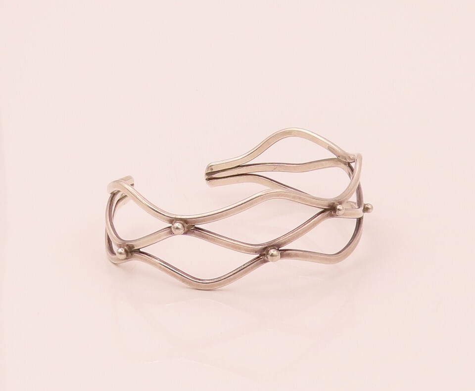 925 Sterling Silver Vintage Three Strand Wave Beaded Cuff Bracelet BT9810