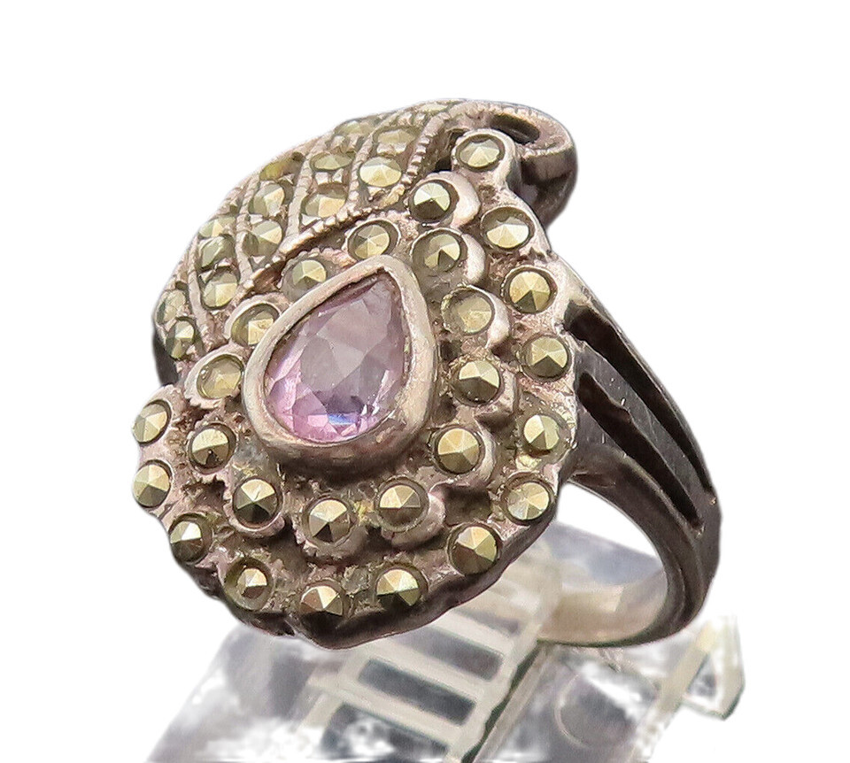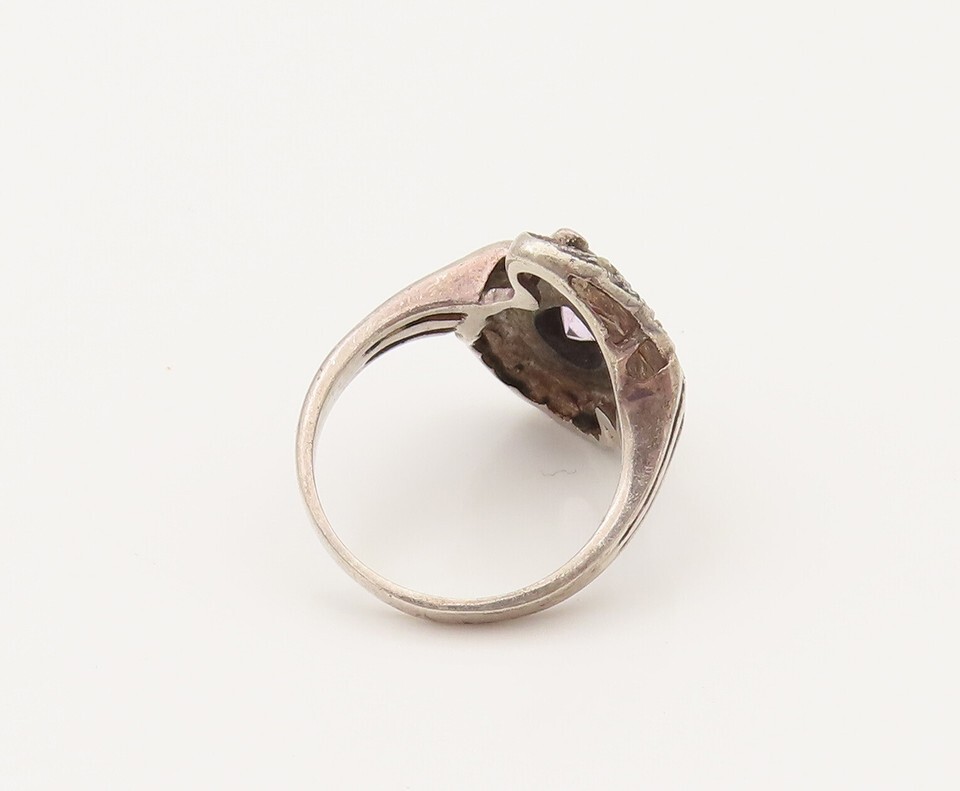 925 Sterling Silver Vintage Amethyst & Marcasite Art Deco Ring Sz 6 RG26478