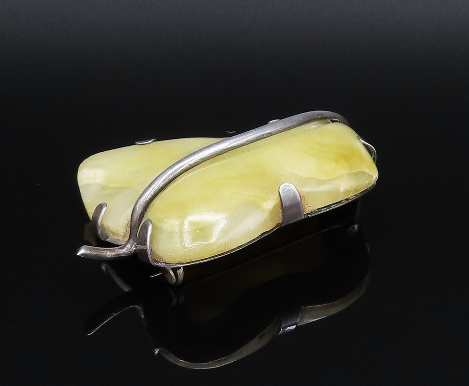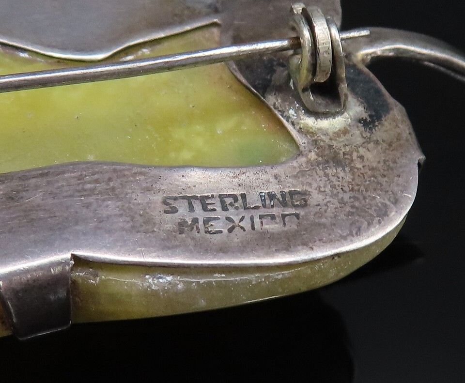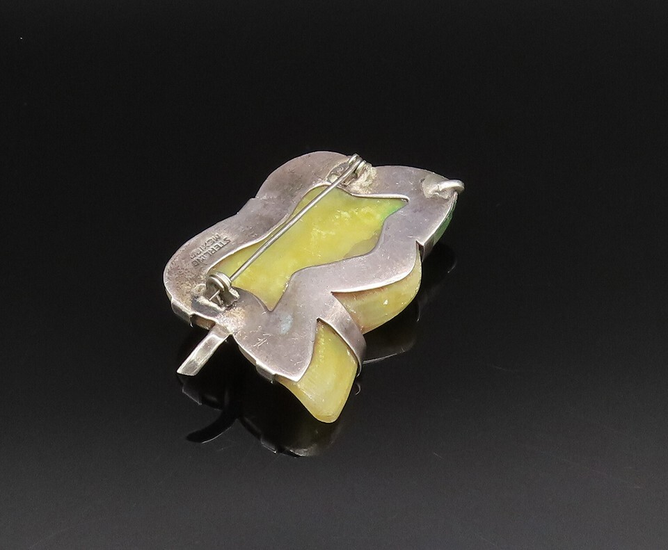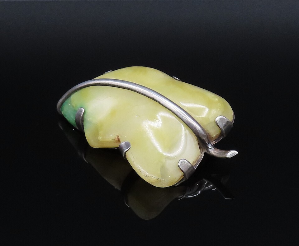 MEXICO 925 Sterling Silver Vintage Unique Yellow Jade Leaf Brooch Pin BP9891