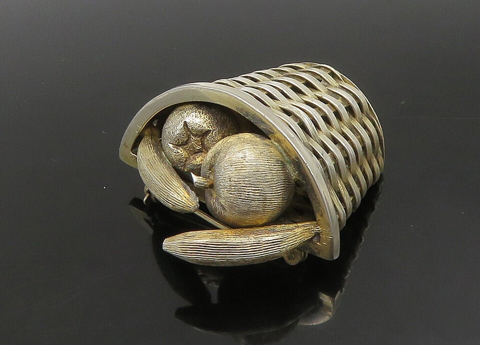 JANNA MEXICO 925 Sterling Silver Vintage Shiny Fruit Basket Brooch Pin BP9134
