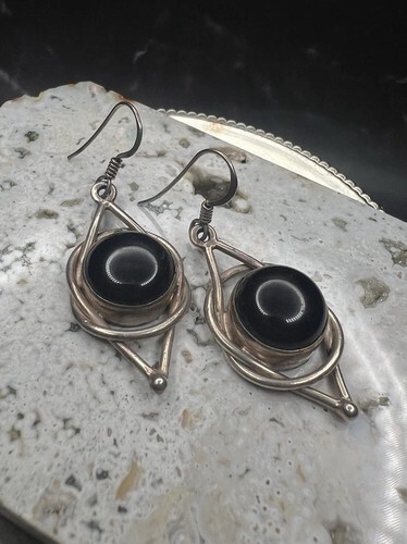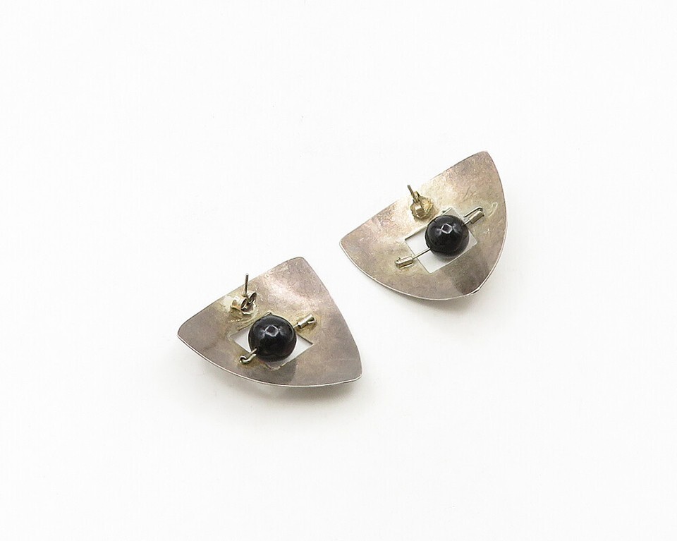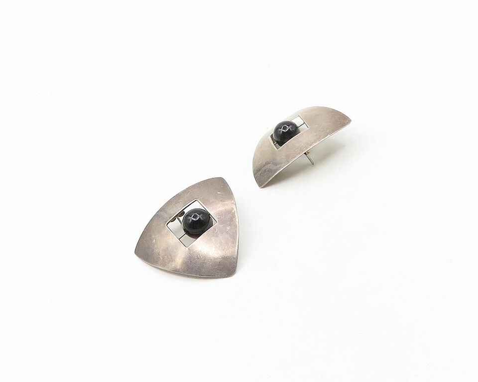 925 Sterling Silver Vintage Black Onyx Modernist Drop Earrings EG9391