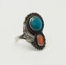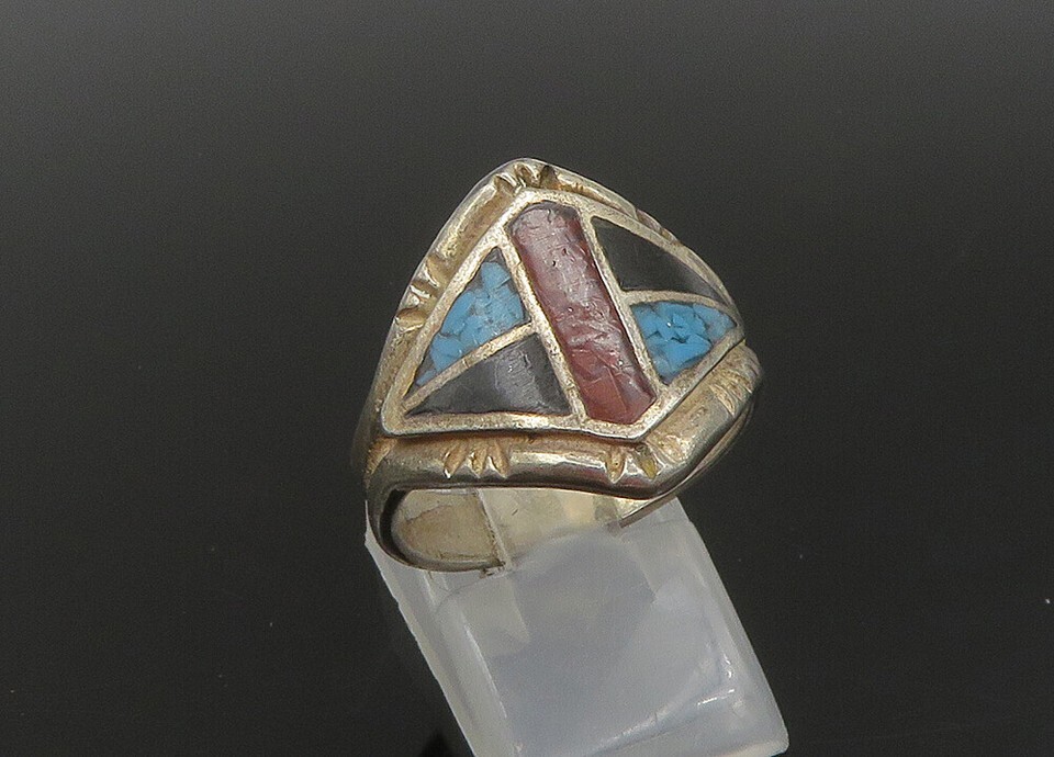 ZUNI NAVAJO 925 Silver Vintage Turquoise Onyx & Coral Band Ring Sz 9 RG22891