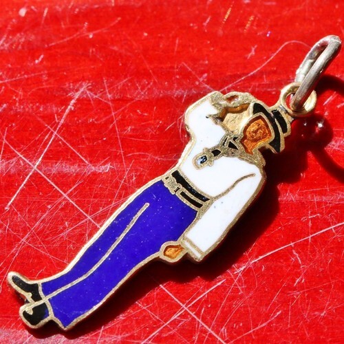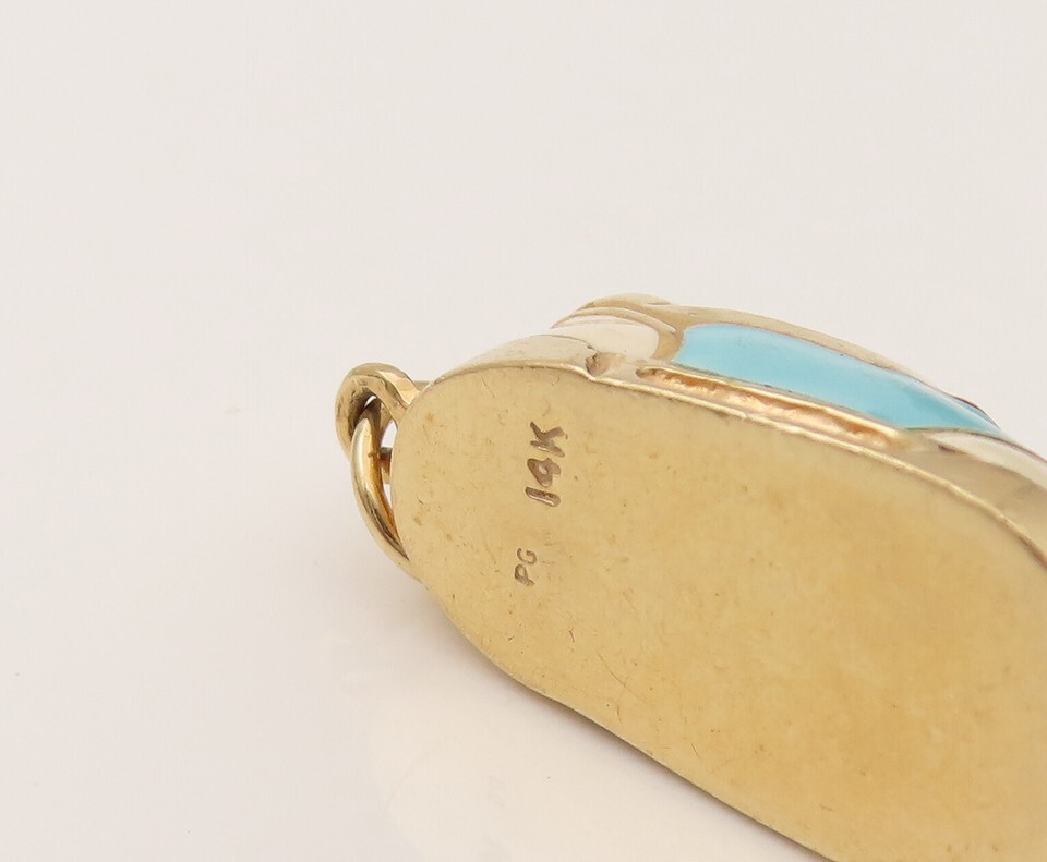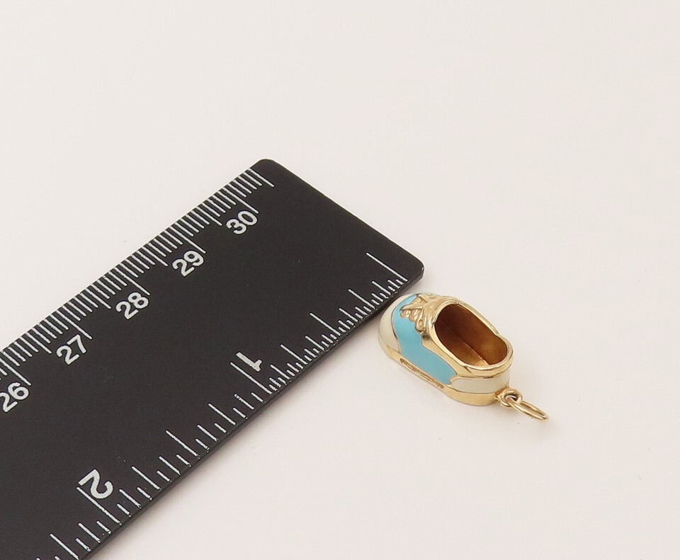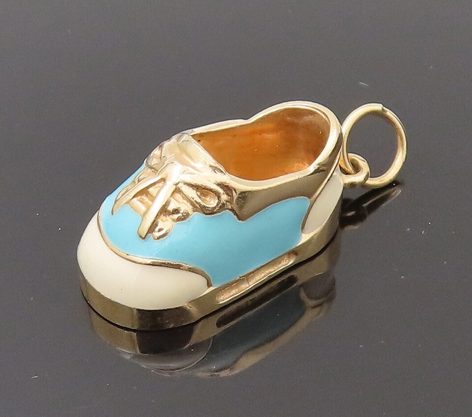 Authenticity Guarantee 14K GOLD Vintage Blue & White Enamel Baby Shoe Charm...