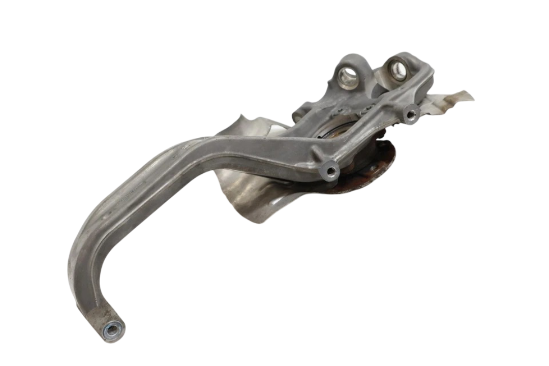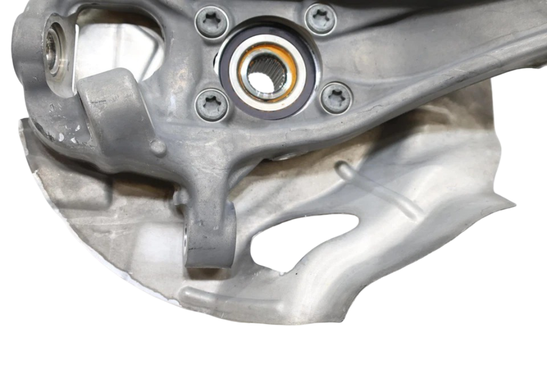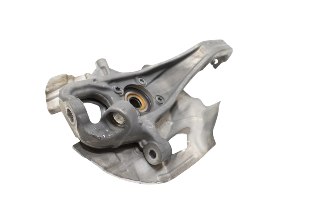 This OEM front left spindle knuckle and hub fits 2020-2025 Alfa Romeo Stelvio models and carries part number 50563123. It is designed to support the front suspension and wheel hub assembly, ensuring proper alignment and safe vehicle operation. The part is in good used condition with normal wear from use, showing no cracks, bends, or damage, and all mounting points and threads are intact. This is a direct replacement OEM part and will be sent with proper tracking.