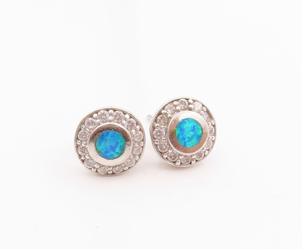 925 Sterling Silver Vintage Earrings Round Fire Opal & Halo CZ Studs EG13702