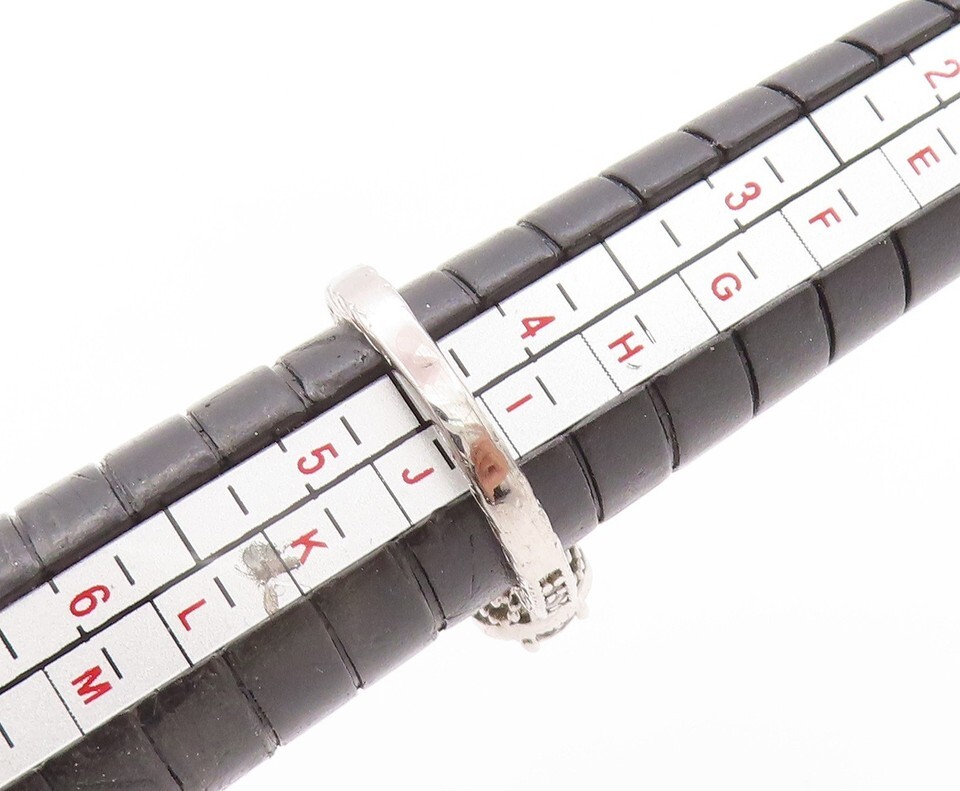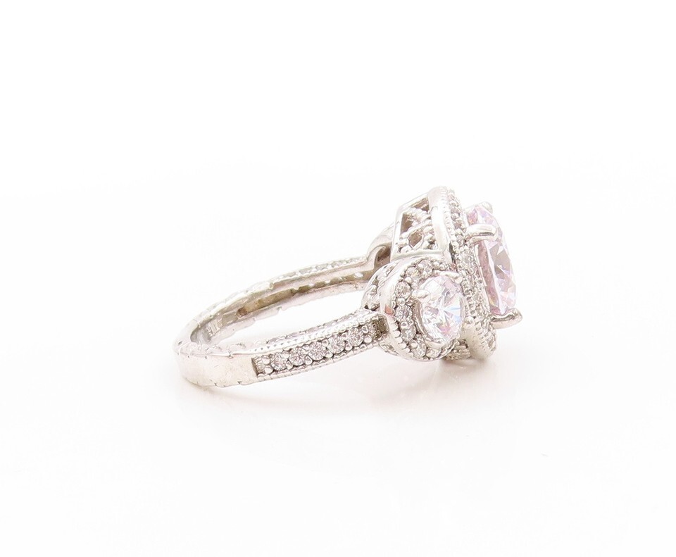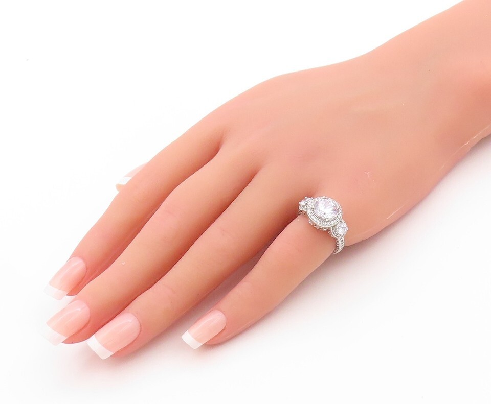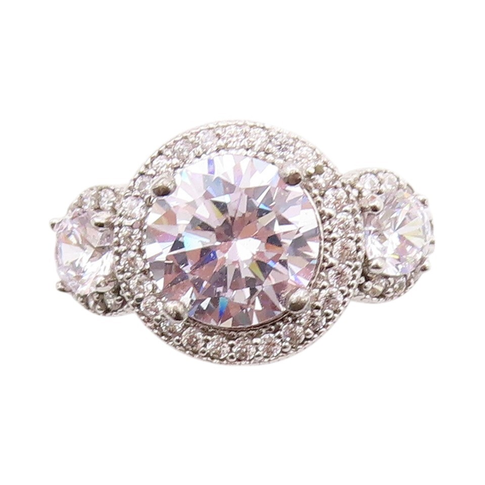 925 Sterling Silver Vintage Ring Three Round Stone Halo CZ Inlay Sz 4.5 RG32723
