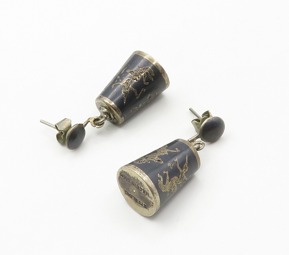 SIAM 925 Sterling Silver Vintage Enamel Niello Dancer Drop Earrings EG7793