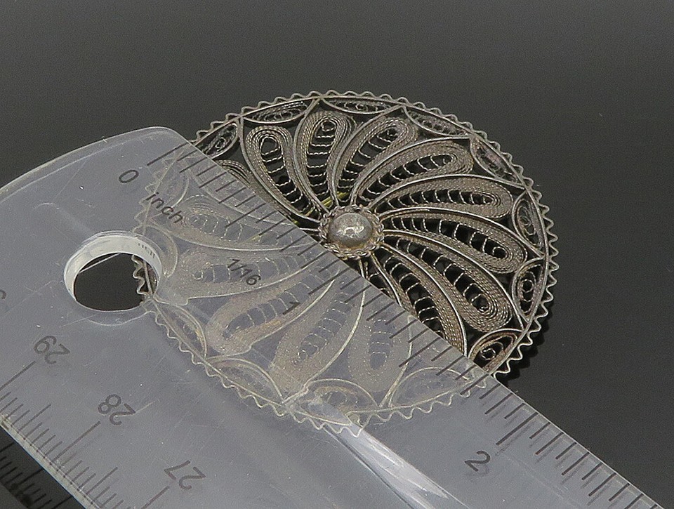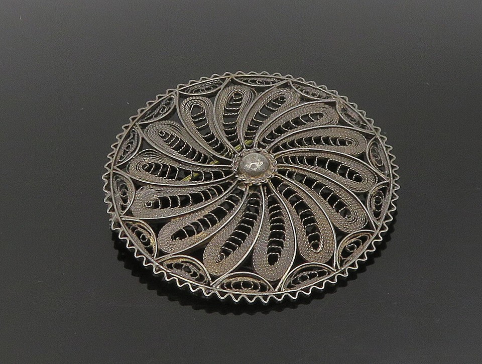 ISRAEL 925 Silver Vintage Antique Floral Motif Wire Mesh Brooch Pin BP9454