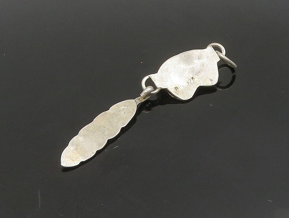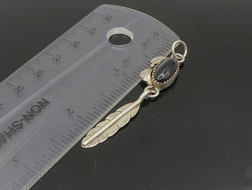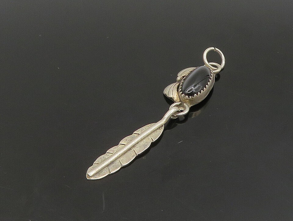NAVAJO 925 Silver Vintage Black Onyx Feather Floral Leaf Pendant PT19556