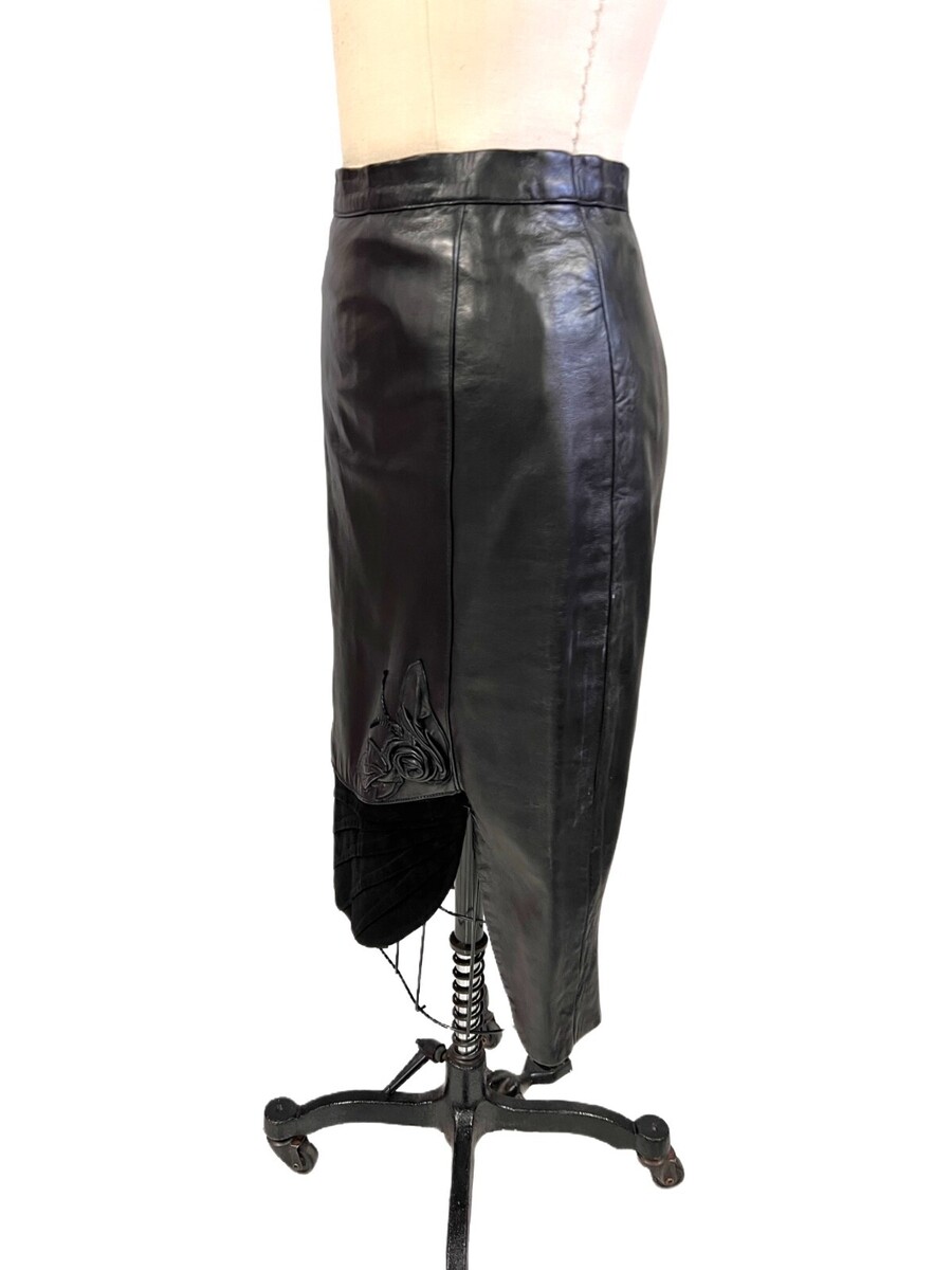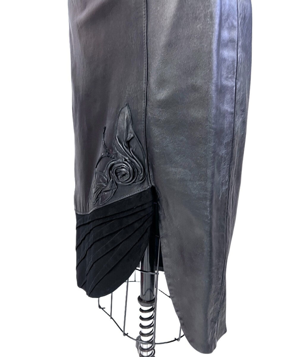 VTG 80s Black Leather Pencil Skirt Suede Pleat Hem Floral Applique Glam S