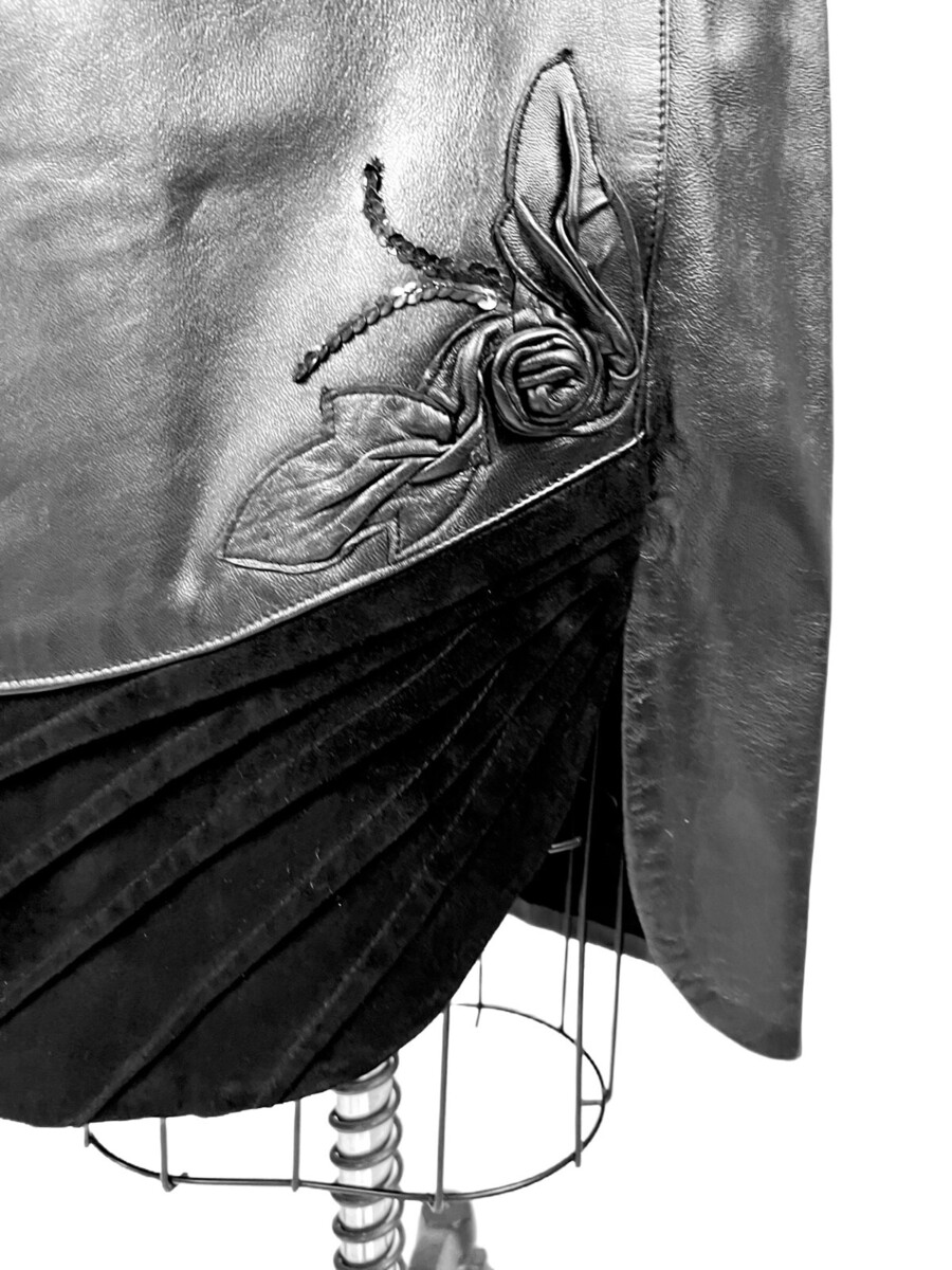 Fabulous vintage 1980s black leather pencil skirt with unique detailing at the hemline. Features a back zipper closure, fully lined acetate interior, and standout design: the hemline is finished with pleated suede and embellished with appliqued leather flowers accented by sequins. A striking piece of 1980s glam fashion.