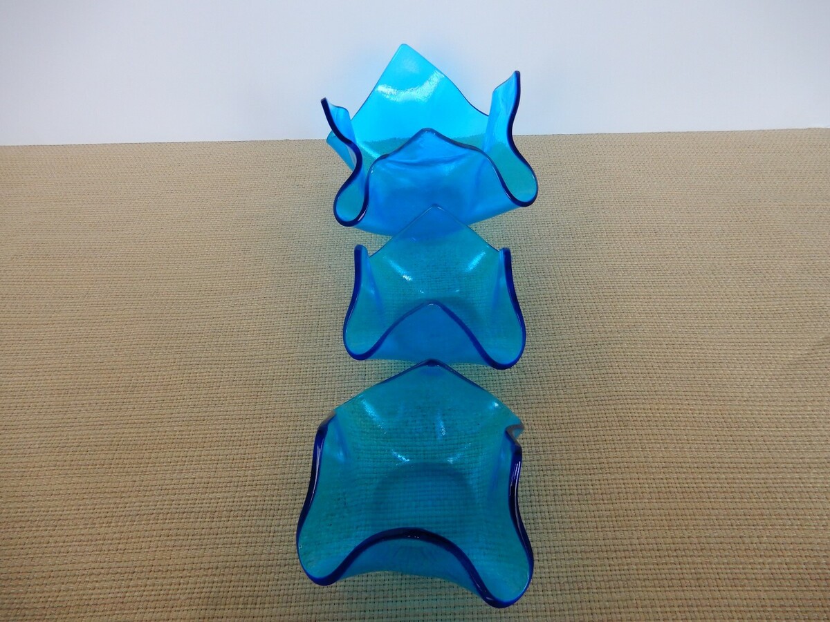 Vintage light blue art glass origami look three piece candleholder set