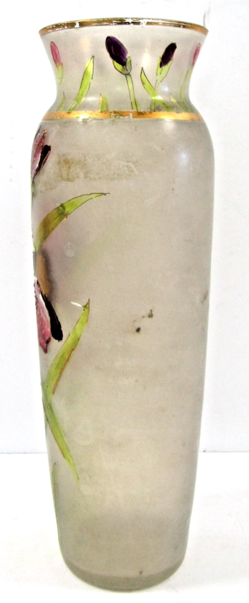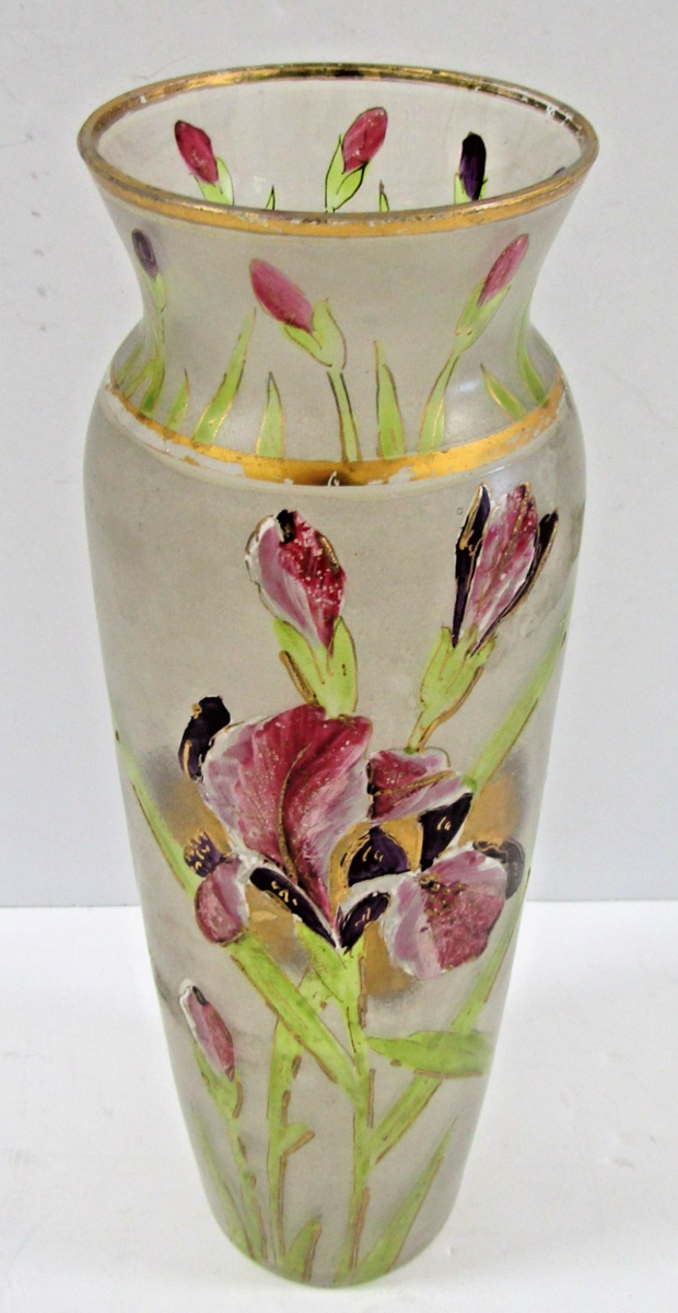 Vintage Mont Joye Legras Hand Painted Iris Flower Frosted Glass Vase