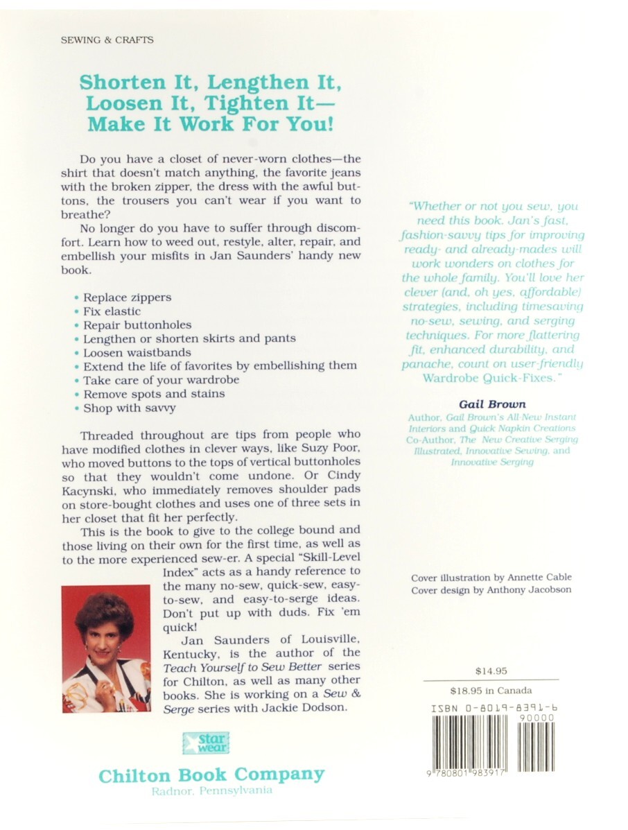 Wardrobe Quick-Fixes by Jan Saunders, published 1995 by the Chilton Book Company. How to adjust, repair, embellish and care for your clothing. Paperback, 162 pages, nearly new condition.