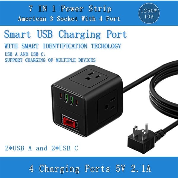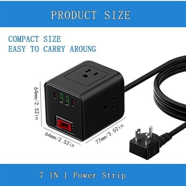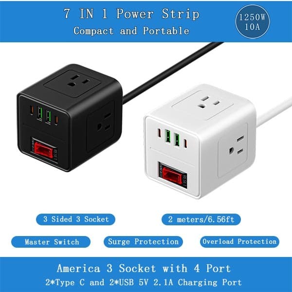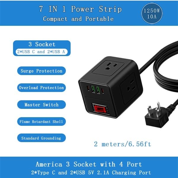 This power strip features 3 AC outlets and 4 USB ports, including 2 USB-C. It includes a 6.5-foot extension cord, perfect for travel, home, and office charging. The integrated charging and master switch ensure convenience and safety. ?