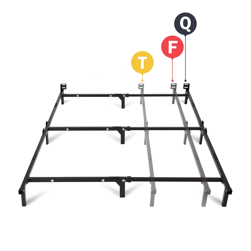 Mainstays Adjustable Metal Bed Frame ? Black Give your mattress and box spring the secure support they deserve with the Mainstays Adjustable Metal Bed Frame. Designed to fit twin, full, or queen sizes, this durable frame is crafted from strong steel and reinforced with welded legs for exceptional stability. An integrated center support beam and built-in headboard brackets make it easy to attach your existing headboard, while nine sturdy feet provide reliable support for up to 1200 pounds. Protective foot caps safeguard your floors from scratches, and the slightly recessed design helps prevent stubbed toes. Best of all, assembly is quick and effortless?no tools require
