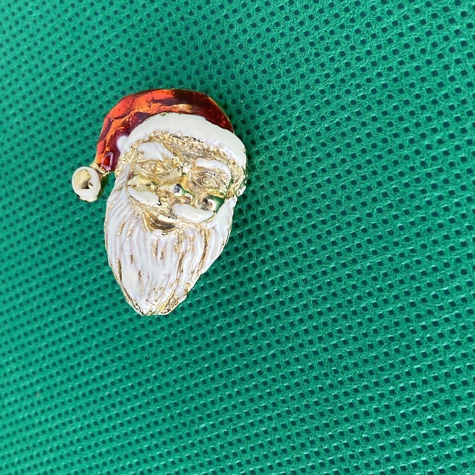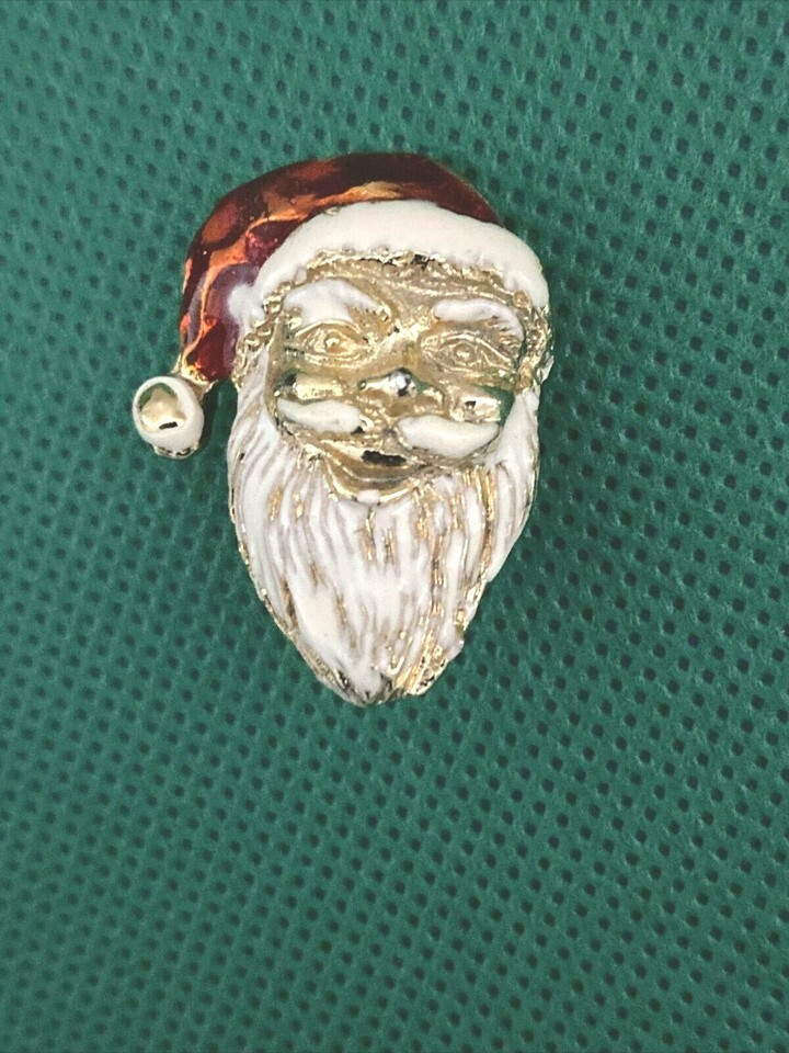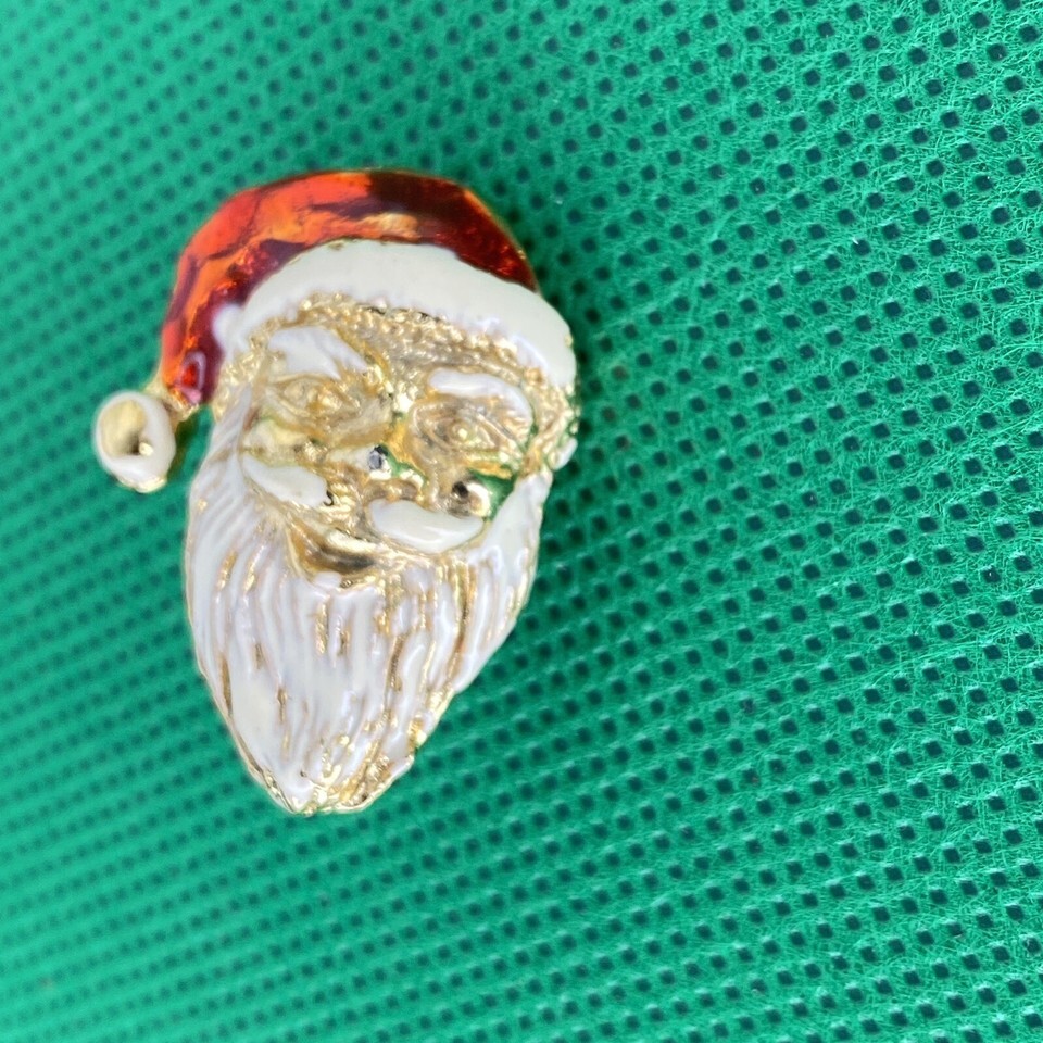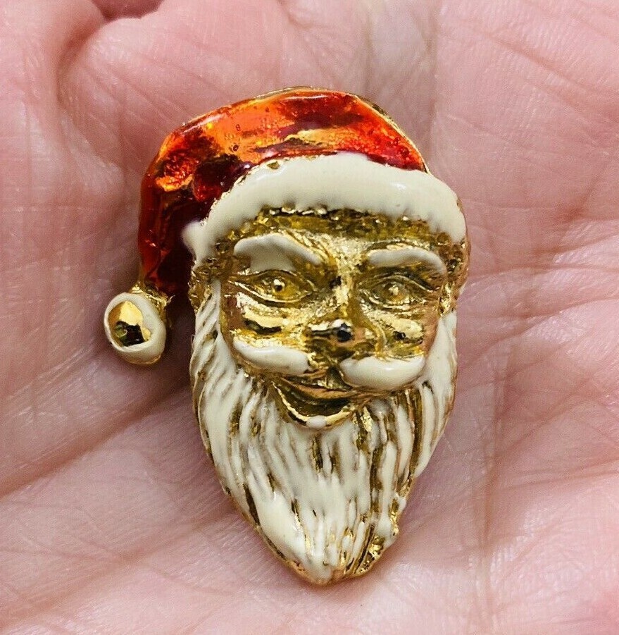 Vintage Christmas Santa Claus Head Brooch Pin Enamel Gold Tone Red Brooch