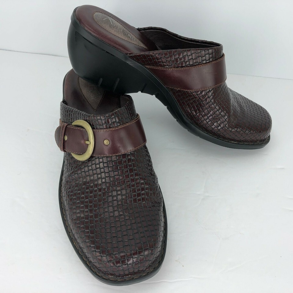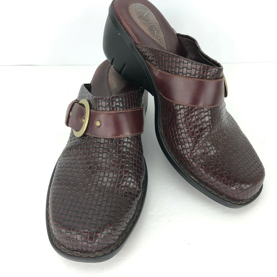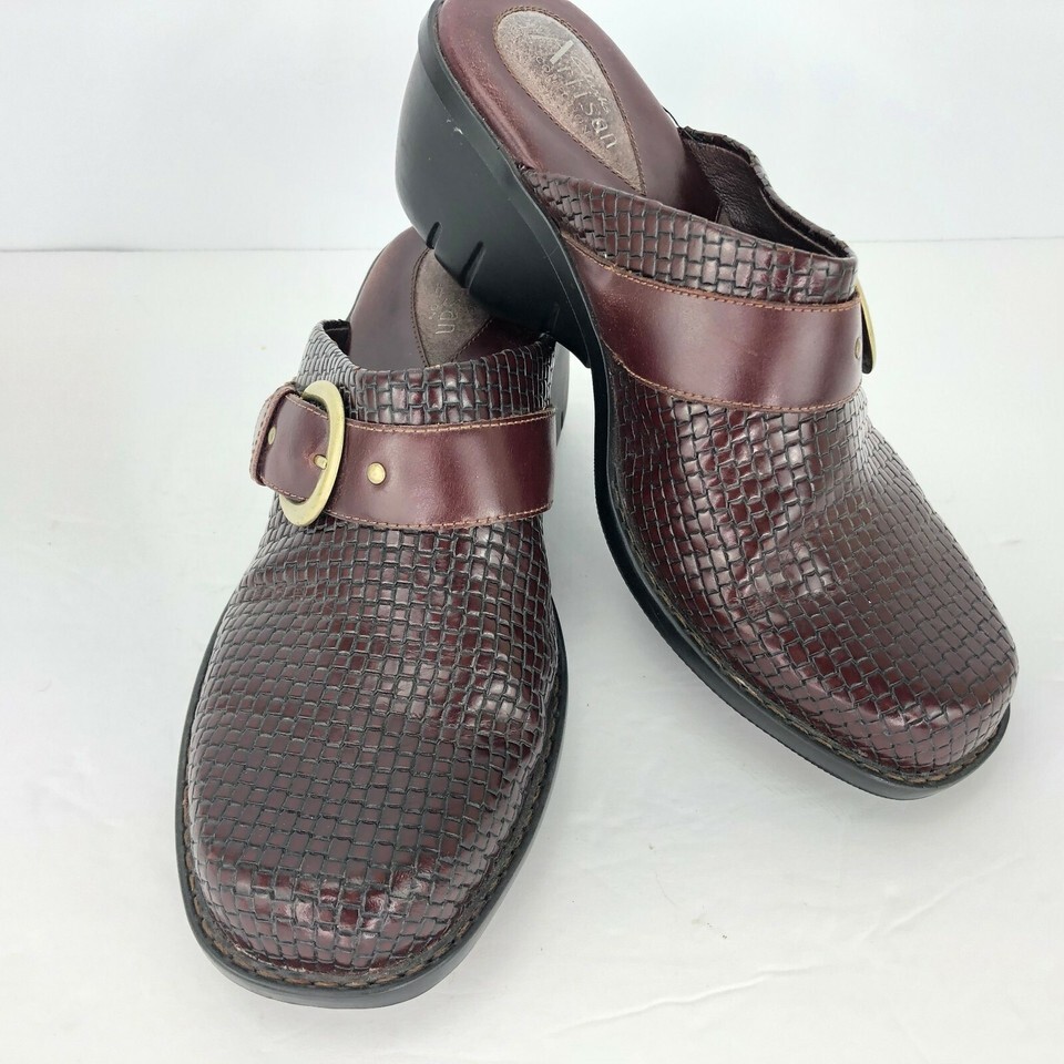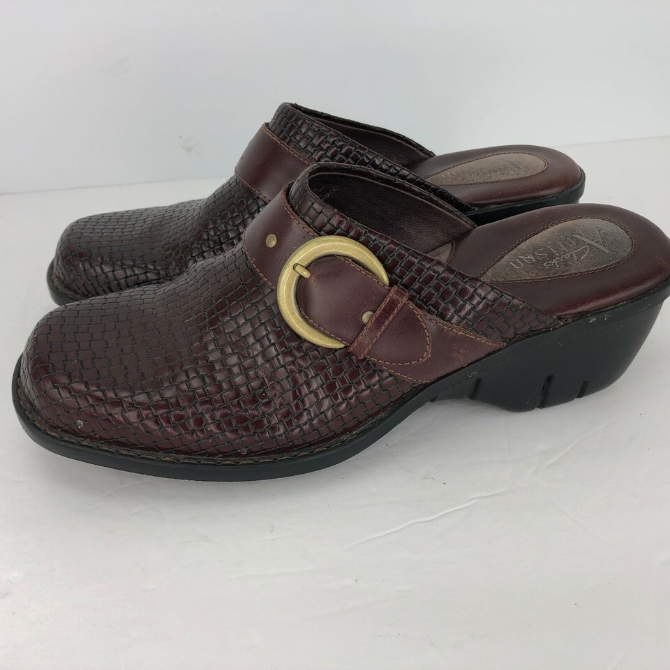 Clarks Artisan 8 M Mules Clogs Shoes Cordovan Woven Leather Buckle Slides Heel