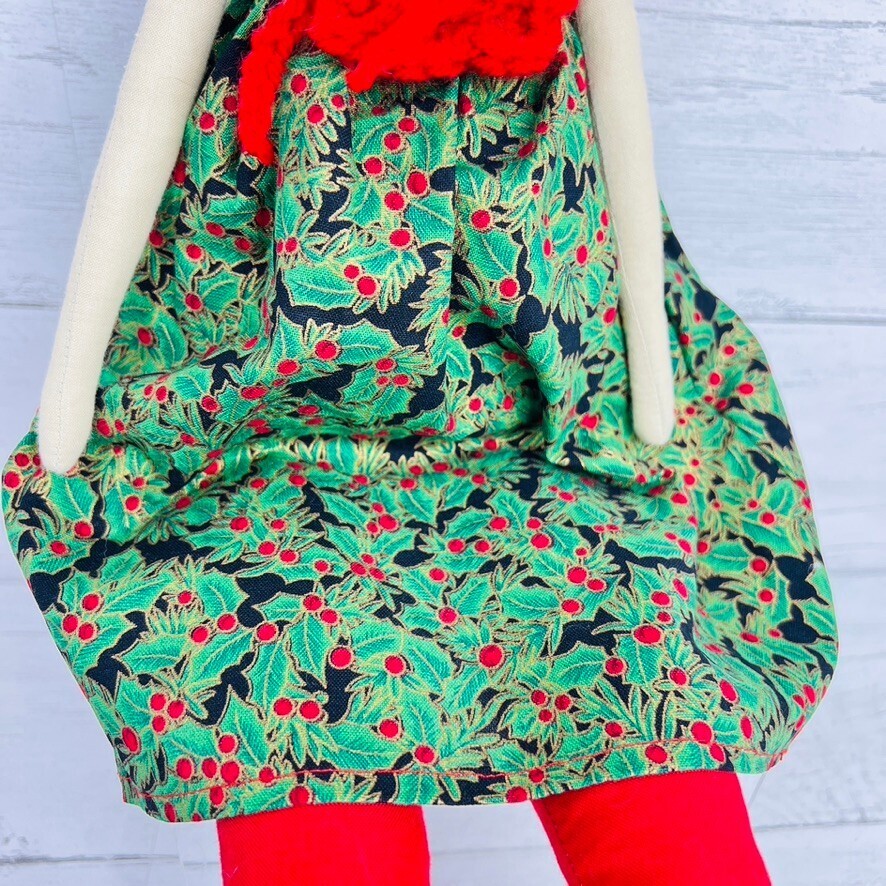 This beautiful Christmas angel plush doll is a unique addition to your holiday decor. Handmade in the United States with intricate details, this doll features a stunning poinsettia dress and a crochet flower in her hair. The doll is made by skilled artisans and is perfect for those who love handcrafted pieces.