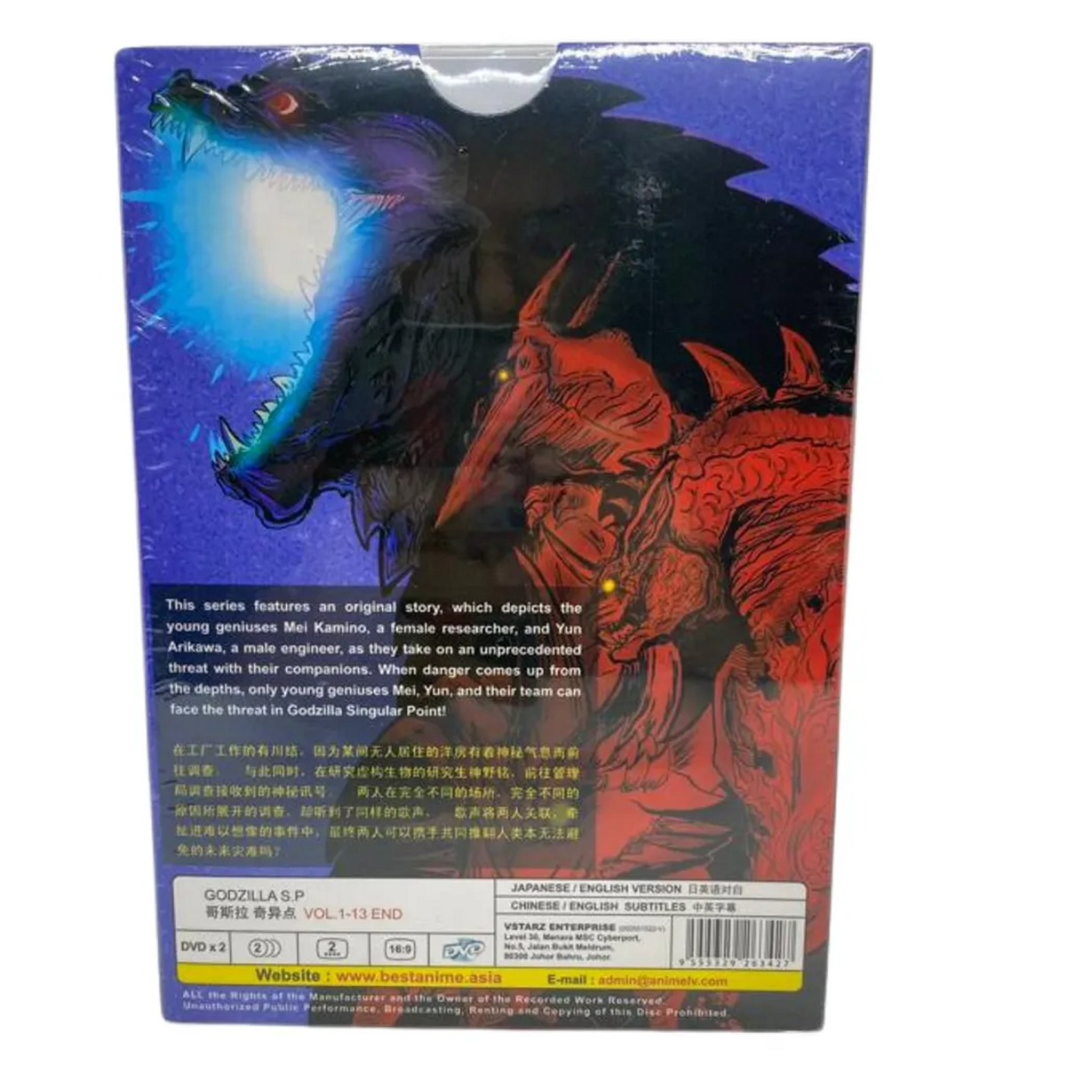 Enjoy the ultimate experience of Godzilla S.P: Singular Point with this complete DVD box set, containing 13 volumes of the anime series. Immerse yourself in the thrilling world of action, sci-fi, mystery, and award-winning drama, featuring English and Chinese subtitles as well as Malay voiceovers. This TV series is rated PG-13 and is packed with exciting features such as dubbed audio, English and Japanese language options, and a region code of DVD: 0/All (Region Free/Worldwide).