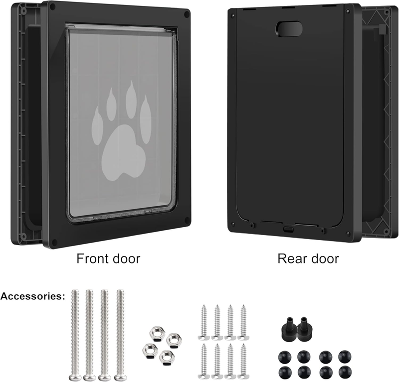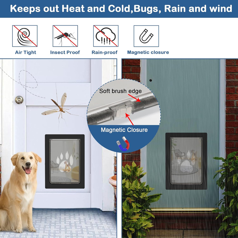 UNIQUE DESIGN: This pet door with a removable flap that has windproof and rainproof seals. It also has a magnetic strip at the bottom to keep it securely closed. It can fit large dogs,small dogs, doggie, cats, and other pets up to 100 pounds.