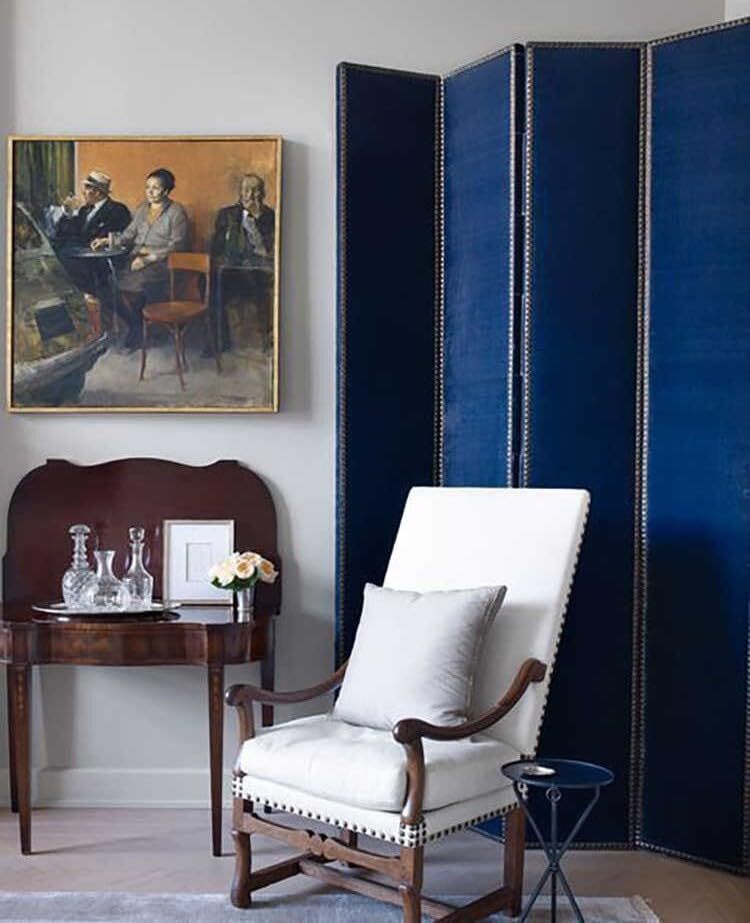 Wakana Indigo Blue 4-Panel Folding Screen Room Divider, Luxury Faux Horse Hair P