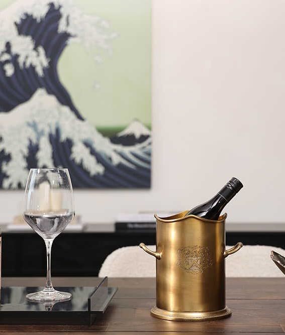Elevate your entertaining experience with this exquisite brass wine ice bucket, where timeless elegance meets practical functionality. Crafted from premium brass with a stunning gold finish, this sophisticated cooler features an embossed heraldic crest that adds a touch of traditional European flair to any setting. Standing 7.1 inches tall with a width of 6.9 inches, it perfectly accommodates standard wine and champagne bottles while maintaining an ideal serving temperature. The thoughtfully designed side handles ensure secure transport from indoor gatherings to outdoor adventures. Whether gracing your home bar, enhancing your dining table, or accompanying you on a camping expedition, this versatile piece serves both as a practical beverage chiller and a distinguished decorative accent. The durable brass construction develops a beautiful patina over time, adding character and vintage appeal to this already striking piece. Its refined proportions make it an ideal addition to any sophisticated space, from compact apartments to spacious entertainment areas.