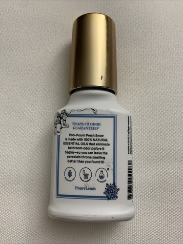The Poo-Pourri Fresh Snow Before-You-Go Toilet Spray is a 2 fl oz container filled with a white, aerosol-based toilet odor neutralizer. It is designed to be used before flushing the toilet, with each spray providing long-lasting freshness up to 100 uses. The Fresh Snow scent, original packaging, and deodorizing properties make it a convenient and effective solution for eliminating unpleasant odors in indoor toilets, making it a must-have for any home or household. New. Snow, fresh air and balsam fir.