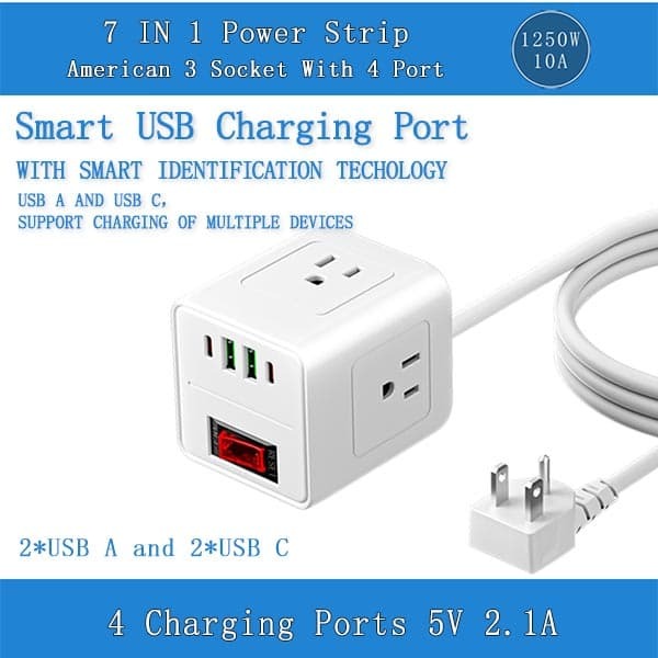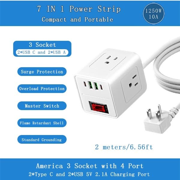 This power strip features 3 AC outlets and 4 USB ports, including 2 USB-C. It includes a 6.5-foot extension cord, perfect for travel, home, and office charging. The integrated charging and master switch ensure convenience and safety. ?