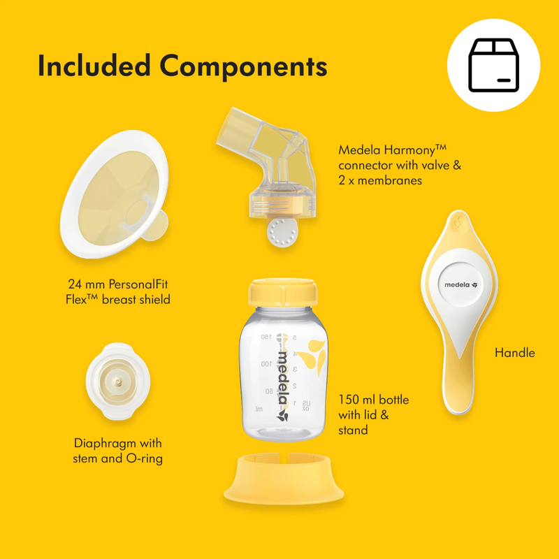 Includes: (1) Medela Harmony pump with handle; (1) diaphragm set (stem O-ring); (1) connector valve; (2) membranes; (1) Flex shield (M); (1) 150 ml bottle with lid; (1) stand; (1) instruction manuals