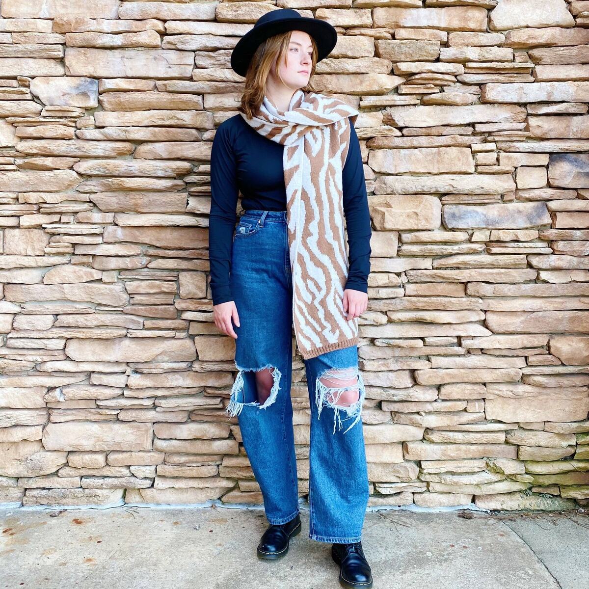 Super cozy knit scarf in trendy pattern inspired by wild life.