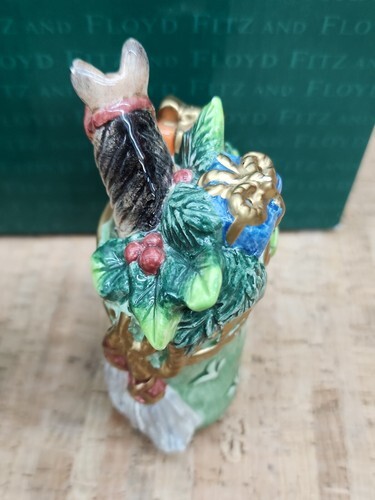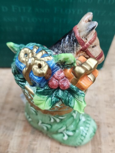 One small chip on the gold bow on the blue present and one flea bite on horses ear