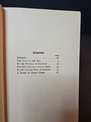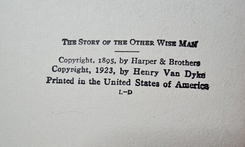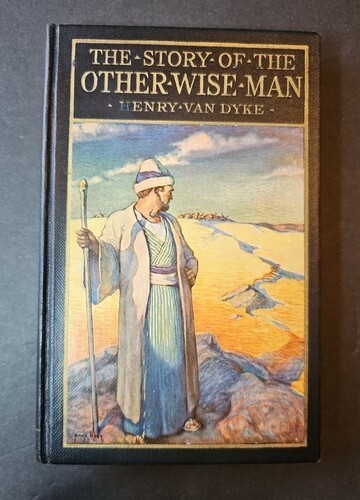 This book was initially published in 1895. This copy is from 1923. The story is an addition and expansion of the account of the Biblical Magi, recounted in the Gospel of Matthew in the New Testament. It tells about a "fourth" wise man (accepting the tradition that the Magi numbered three), a priest of the Magi named Artaban, one of the Medes from Persia. Like the other Magi, he sees signs in the heavens proclaiming that a King had been born among the Jews. Like them, he sets out to see the newborn ruler, carrying treasures to give as gifts to the child - a sapphire, a ruby, and a "pearl of great price". However, he stops along the way to help a dying man, which makes him late to meet with the caravan of the other three wise men. Because he missed the caravan, and he can't cross the desert with only a horse, he is forced to sell one of his treasures in order to buy the camels and supplies necessary for the trip. He then commences his journey but arrives in Bethlehem too late to see the child, whose parents have fled to Egypt. He saves the life of a child at the price of another of his treasures. A large star sapphire, the Star of Artaban, was named for this story. It is currently found at the Smithsonian National Museum of Natural History. This book has been adapted into plays, television shows and operas