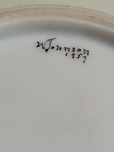This was hand painted and signed in 1957--a trend back then to get blanks and then go to a studio and paint them.