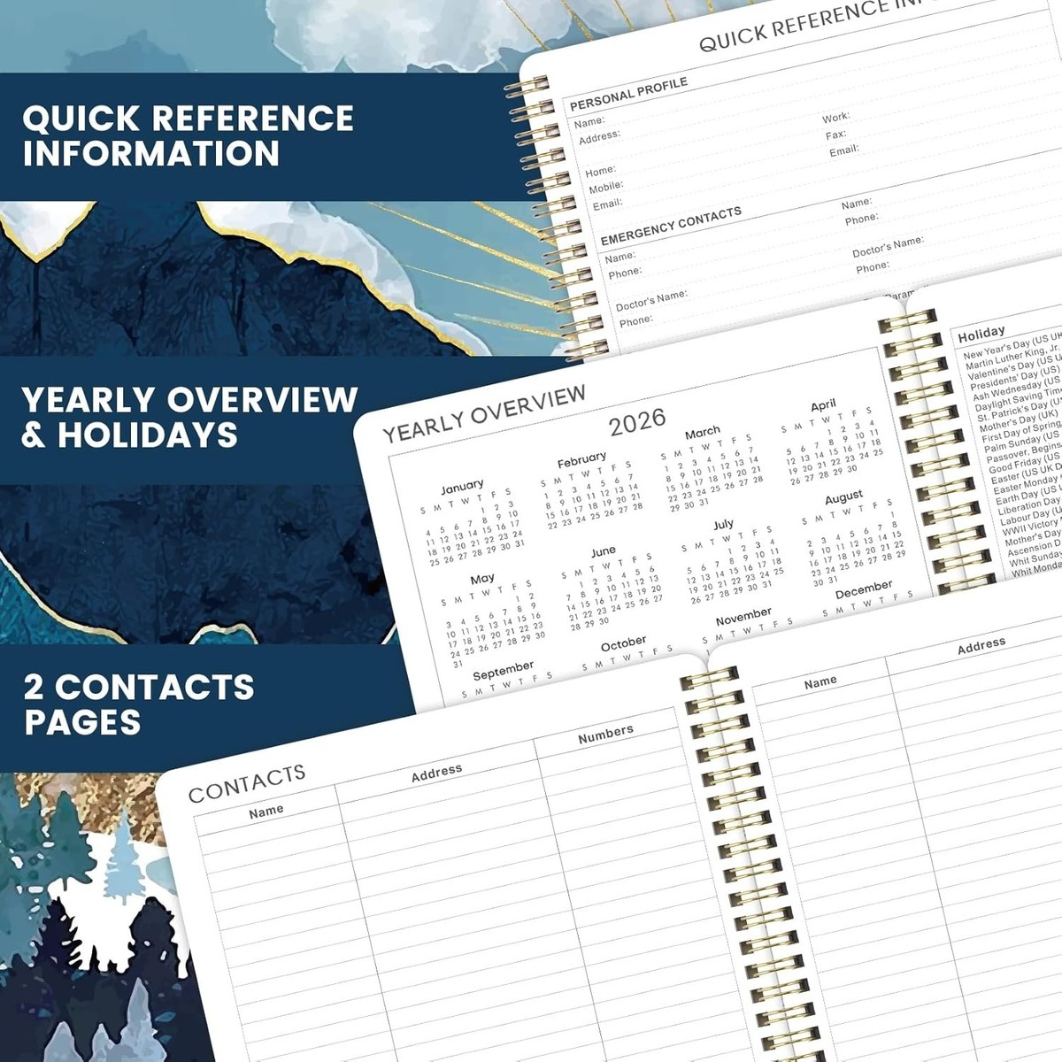 Convenient Extras: Includes quick reference information, a yearly overview for 2026-2027, holidays from 2026-2028, contact pages, Julian dates, and an ample notes section.
