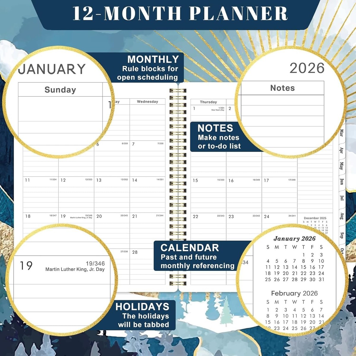 Monthly Pages: Each offers a comprehensive overview, complete with ruled daily blocks, highlighted holidays, reference calendars, and a notes section to keep your affairs organized and reflective.