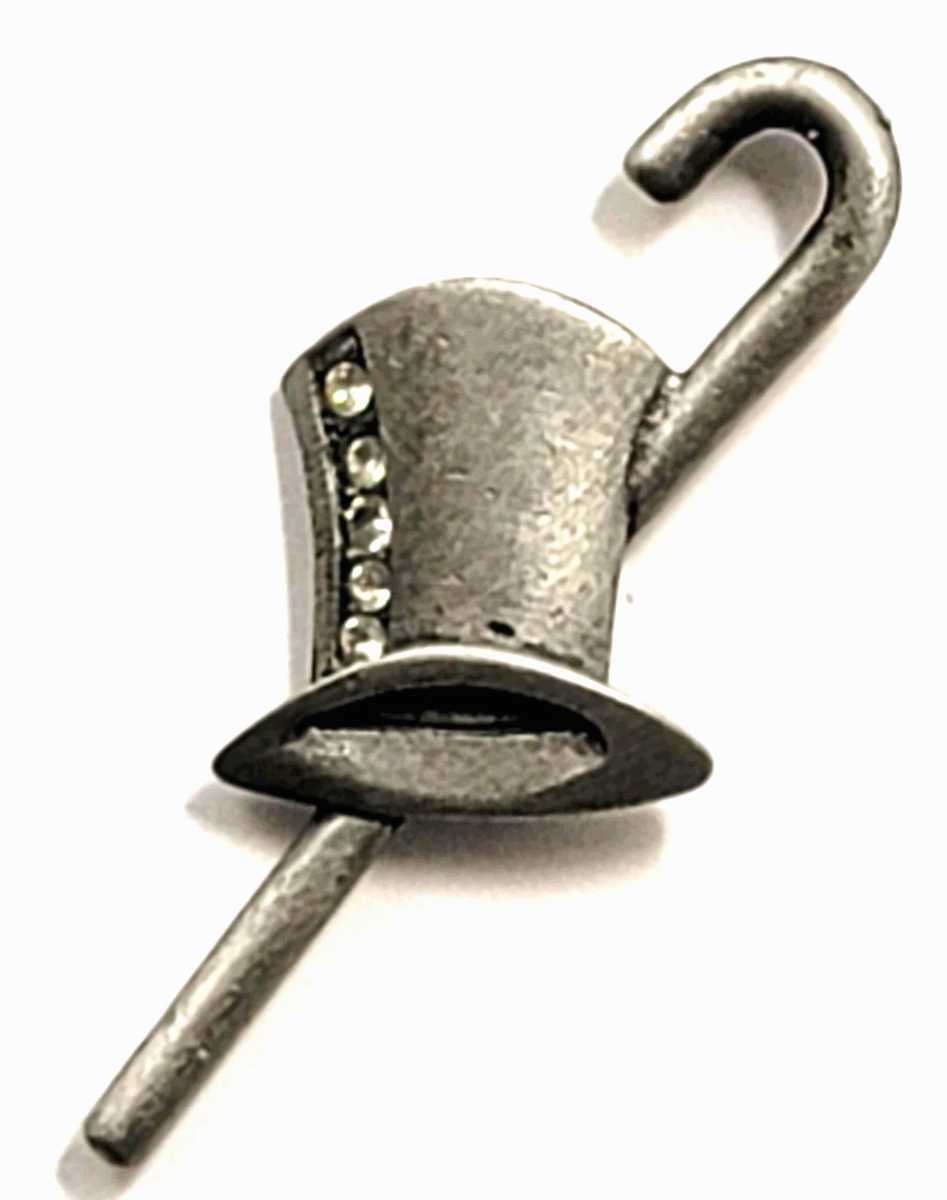 Vintage Top Hat Cane Signed JJ Jonette Jewelry Clear Rhinestones Pewter Tone Pin