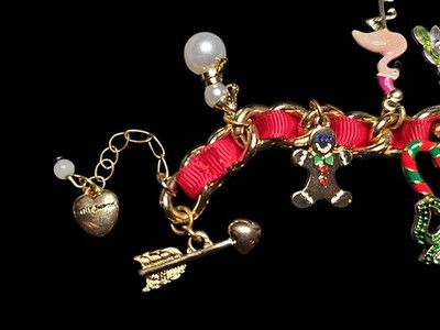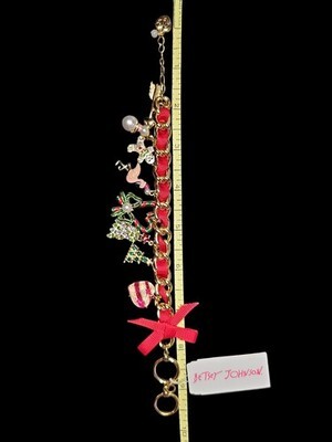 New Betsey Johnson Christmas gingerbread charm bracelet featuring festive enamel charms, crystals, and a signature red ribbon accent. Playful holiday motifs include gingerbread figures, ornaments, and seasonal details.